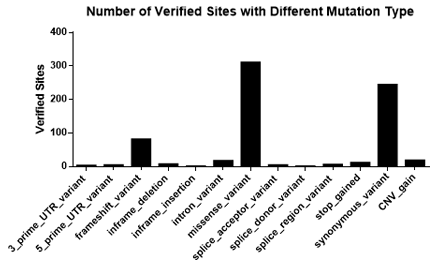 表1. 泛腫瘤相關(guān)靶向基因部分展示 3. 染色體全覆蓋,除了Y染色體外,其他染色體都有涉及; 圖1. 在不同染色體編號(hào)上的位點(diǎn)數(shù)(經(jīng)過(guò)驗(yàn)證的位點(diǎn)) 4. 變異種類多:涉及SNP,deletion,insertion,CNV等等; 圖2. 不同種類突變形式的位點(diǎn)數(shù)(經(jīng)過(guò)驗(yàn)證的位點(diǎn)) 5. 突變頻率全覆蓋,從1%-100%,各區(qū)間都有涉及; 圖3. 不同突變頻率的位點(diǎn)數(shù)(經(jīng)過(guò)驗(yàn)證的位點(diǎn)) 6. 突變類型全覆蓋,有UTR區(qū)域,有內(nèi)含子,有外顯子,有錯(cuò)義突變,有同義突變,有供體變異等等; 圖4. 突變細(xì)分種類的位點(diǎn)數(shù)(經(jīng)過(guò)驗(yàn)證的位點(diǎn)) 7. 位點(diǎn)多,超過(guò)680個(gè)位點(diǎn),全部有對(duì)應(yīng)的Cosmic ID或/和dbSNP ID注釋; 圖5. 經(jīng)過(guò)dbSNP ID和Cosmic ID注釋的位點(diǎn)數(shù)(經(jīng)過(guò)驗(yàn)證的位點(diǎn)) 8. 多平臺(tái)驗(yàn)證,數(shù)據(jù)準(zhǔn)確可信賴; 8.1 其中1000x panel驗(yàn)證16個(gè)位點(diǎn),panel為知名商業(yè)化公司產(chǎn)品; 表2. 16個(gè)經(jīng)過(guò)1000x NGS-Panel試劑盒驗(yàn)證的位點(diǎn)信息 8.2 DdPCR驗(yàn)證8個(gè)位點(diǎn),Bio-Rad QX200和Bio-Rad原裝試劑 表3. 8個(gè)經(jīng)過(guò)DdPCR(bio-rad)試劑盒驗(yàn)證的位點(diǎn)信息 8.3 500X WES驗(yàn)證所有位點(diǎn),IDT xGenExome Research Panel v1.0捕獲,HiSeq X-TEN測(cè)序 表4. 500X WES驗(yàn)證的400個(gè)基因信息 9. 基因覆蓋科學(xué),超過(guò)400個(gè)基因,覆蓋國(guó)內(nèi)外多個(gè)知名panel的設(shè)計(jì); 表5. 基因覆蓋率比較 免費(fèi)試用活動(dòng)開(kāi)始了,感興趣的親們可以聯(lián)系我們4008-750-250 |
