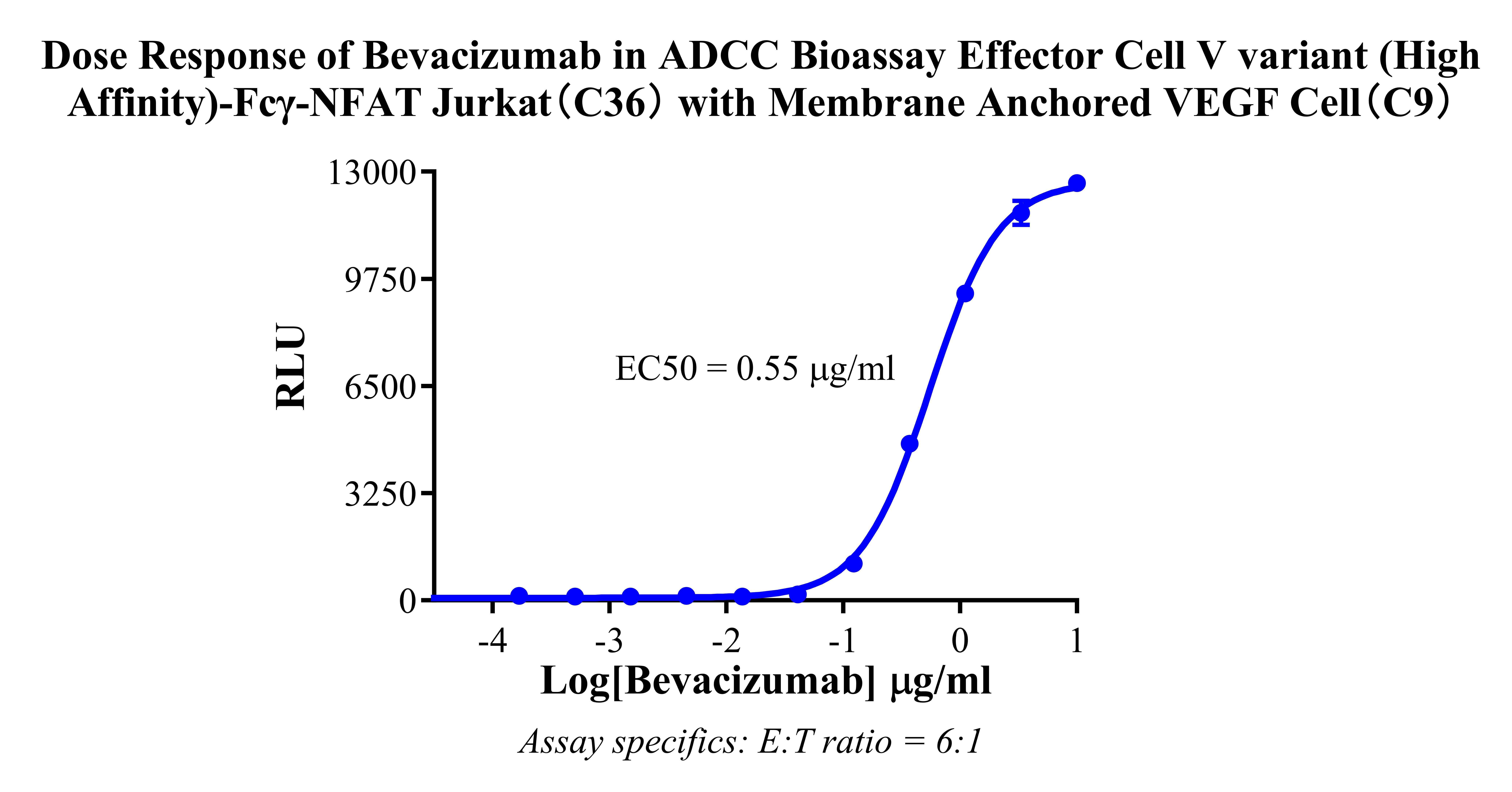 Figure 2. Dose response of Bevacizumab in ADCC Bioassay Effector Cell (High Affinity/NFAT-Jurkat cells) With Membrane Anchored VEGF Cell(C9). |
