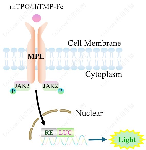 TPO Effector Reporter Cell 報(bào)告基因藥靶模型很好的模擬了體內(nèi) TPO 的信號(hào)轉(zhuǎn)導(dǎo)過程, 原理見下圖所示。