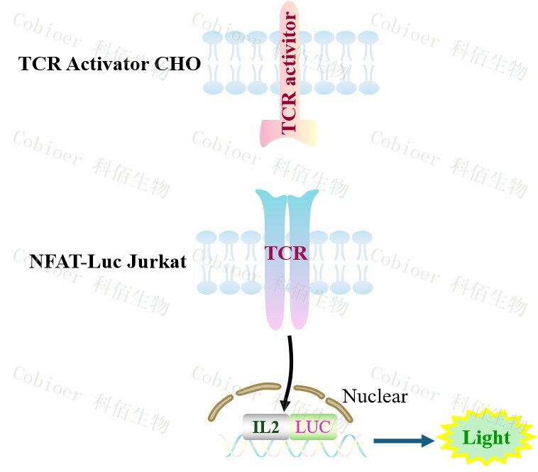 TCR Activator CHO 報(bào)告基因藥靶模型很好的模擬了體內(nèi) TCR 的信號(hào)轉(zhuǎn)導(dǎo)過(guò)程,原理見下圖所示。![]() Figure 1. TCR Activator CHO 細(xì)胞模型原理圖 |