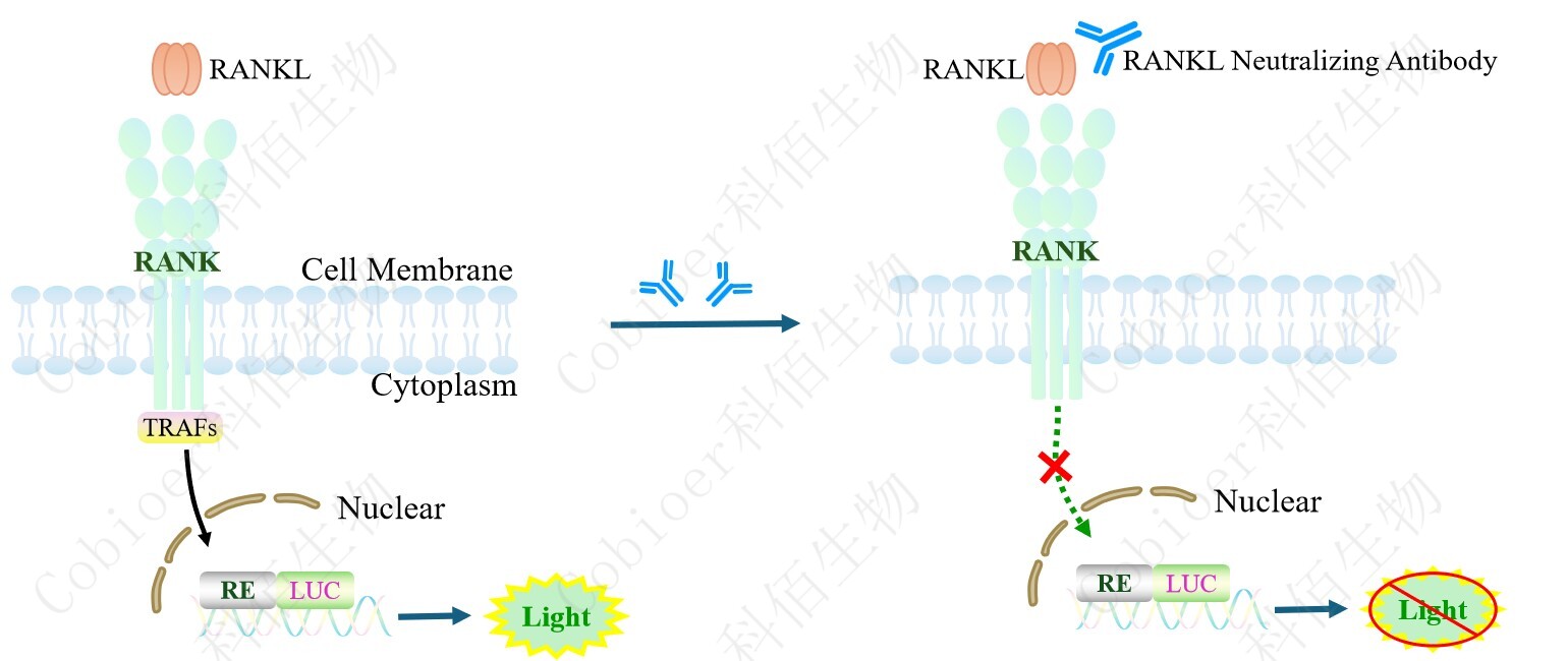 RANK Effector Reporter Cell 報告基因藥靶模型很好的模擬了體內 RANK 的信號轉導過程,原理見下圖所示。![]() Figure 1. RANK Effector Reporter Cell 細胞模型原理圖 |