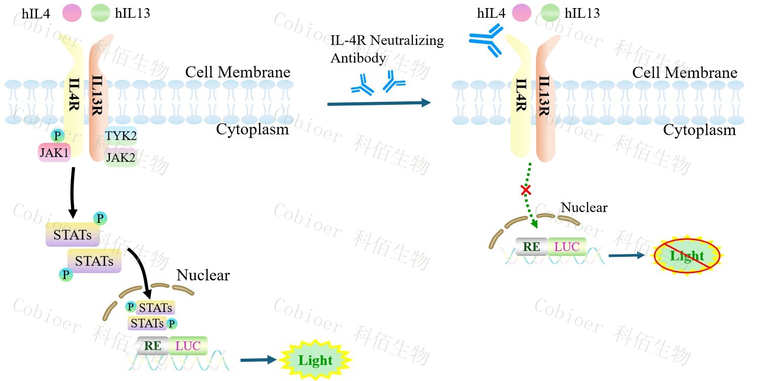 IL4/IL13 Effector Reporter Cell 報(bào)告基因藥靶模型很好的模擬了體內(nèi) IL4/IL13 的信號(hào)轉(zhuǎn) 導(dǎo)過(guò)程,原理見(jiàn)下圖所示。
