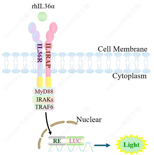 IL36 Effector Reporter Cell 報告基因藥靶模型很好的模擬了體內 IL36 的信號轉導過程, 原理見下圖所示。