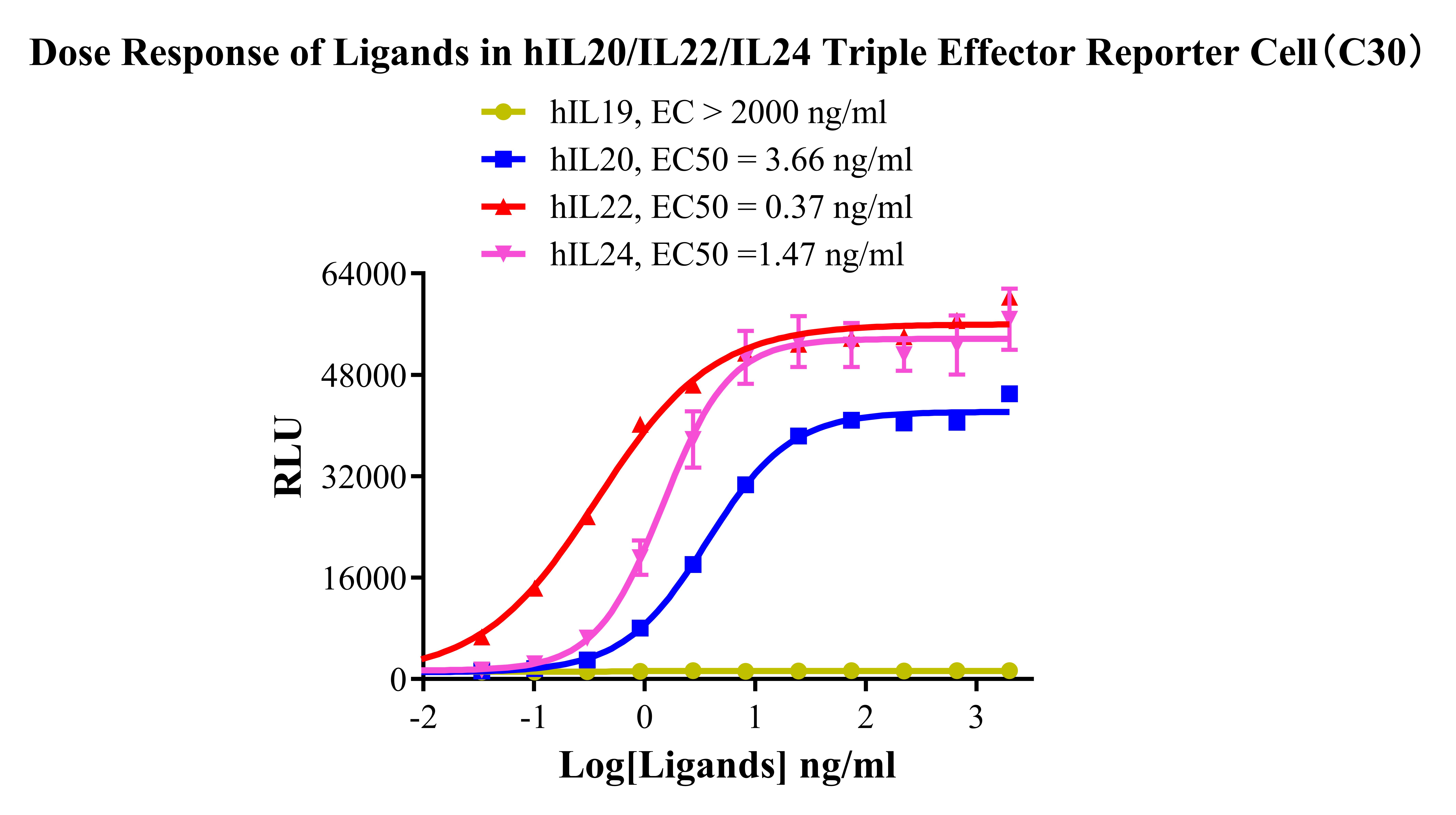 Figure 3. Dose Response of Ligands in hlL20/IL22/lL24 Triple Effector Reporter Cell(C30).