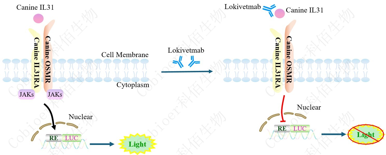 Canine IL31 Effector Reporter 報告基因藥靶模型很好的模擬了體內(nèi) IL31 的信號轉(zhuǎn)導過 程,原理見下圖所示。
