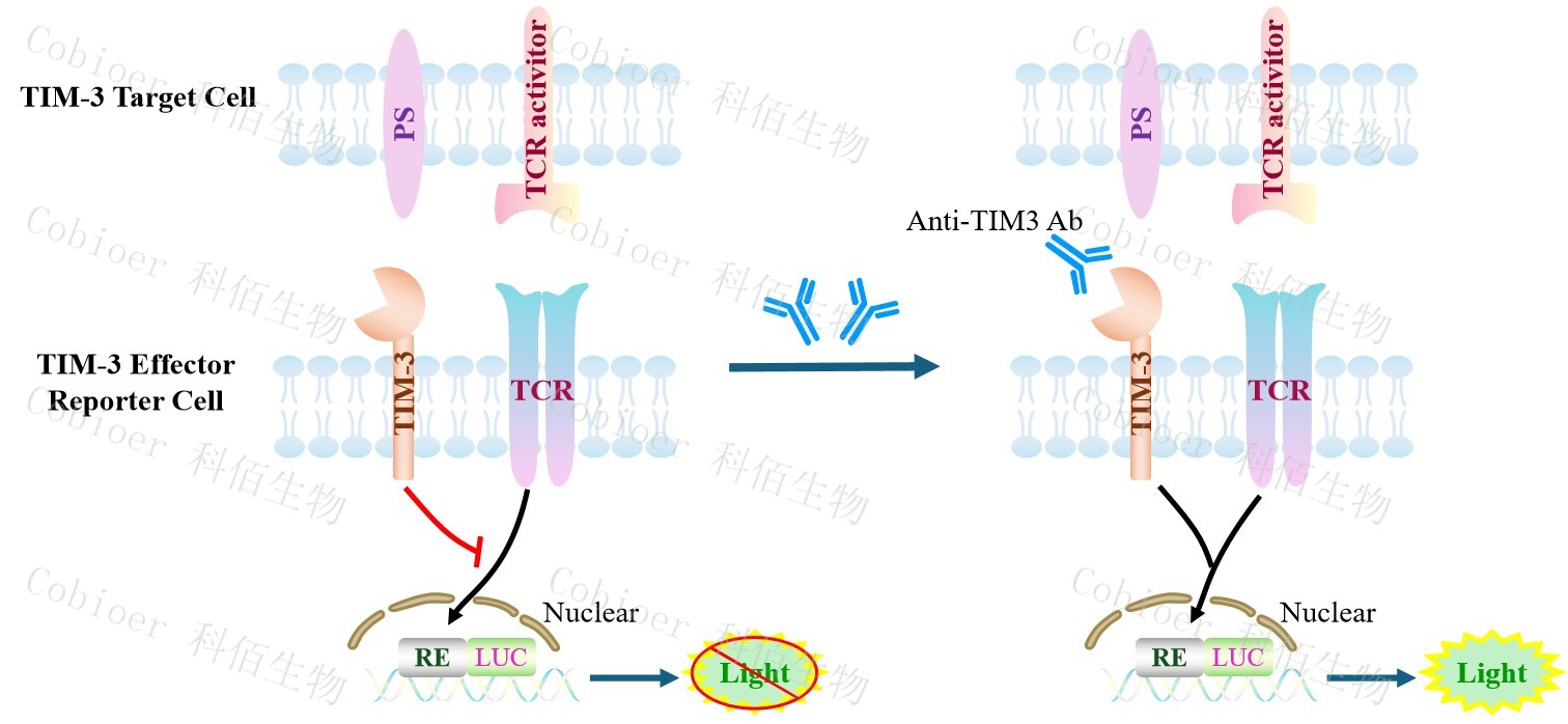 TIM-3 Target Cell 作為 TIM-3 Effector Reporter Cell 的靶細(xì)胞,報(bào)告基因藥靶模型很好的模擬了體內(nèi) TIM-3 的信號轉(zhuǎn)導(dǎo)過程,原理見下圖所示。![]() Figure 1. TIM-3 Target Cell 細(xì)胞模型原理圖 |