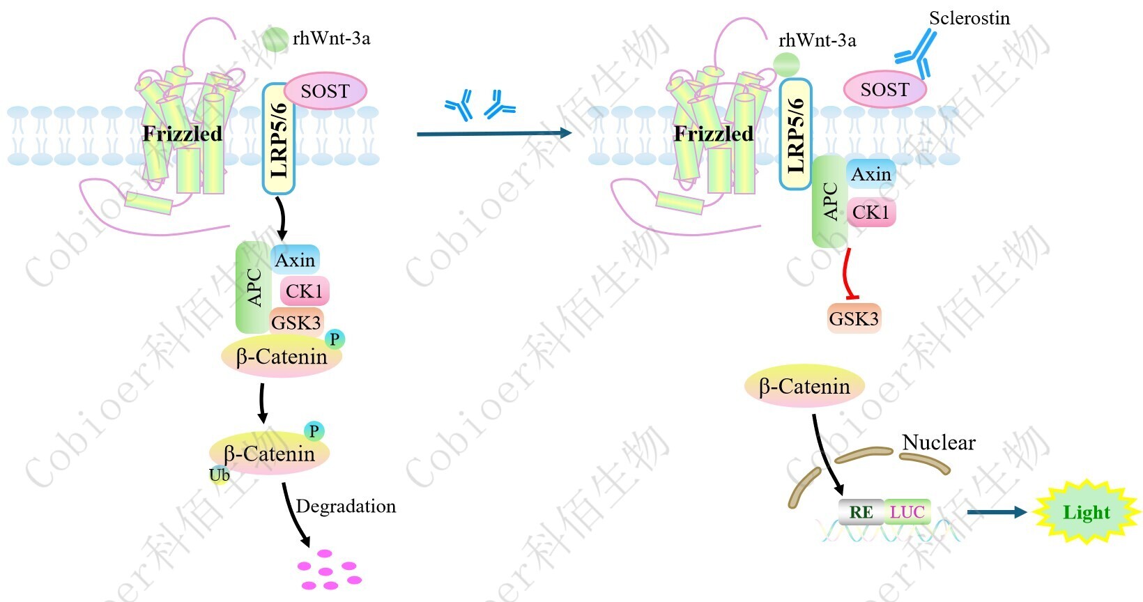 Wnt 信號通路是一種進(jìn)化保守的通路,控制發(fā)育的多個方面,包括成人發(fā)育過程中的 細(xì)胞增殖、細(xì)胞凋亡、細(xì)胞遷移和細(xì)胞極性以及干細(xì)胞維持。 低密度脂蛋白(LDL)受體相關(guān)蛋白 5/6(LRP5/6)是單層跨膜糖蛋白,是典型 Wnt 信號 通路的重要共受體。LRP5/6 有由四個重復(fù)單元(E1,E2,E3 和 E4)組成的細(xì)胞外結(jié)構(gòu)域 (ECD),且 ECD 是 Wnt 信號傳導(dǎo)的重要調(diào)控位點,為 Wnt 配體提供了至少兩個獨立的結(jié)合 位點。典型 Wnt 信號通路的激活發(fā)生在 Wnt 配體與其共受體 LRP5/6 結(jié)合,然后與卷曲受 體(FZD)形成復(fù)合物。Wnt-FZD-LRP5/6 復(fù)合體的形成,Axin 介導(dǎo)的破壞復(fù)合體就會通過被 破壞復(fù)合體內(nèi)的其他蛋白質(zhì)磷酸化而轉(zhuǎn)運(yùn)到質(zhì)膜上,從而抑制 b-catenin 的磷酸化。該破壞 復(fù)合體由 Axin、APC、CK1 和 GSK3 組成。 硬化蛋白(SOST)是一種主要在骨細(xì)胞中表達(dá)的分泌糖蛋白。SOST 和 Wnt 蛋白通過 競爭性結(jié)合 LRP5/6,抑制 Wnt 信號傳導(dǎo),抑制新骨的形成和生長。 |