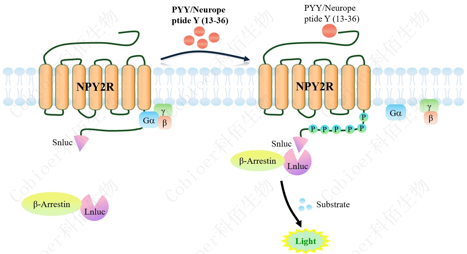 NPY2R β-Arrestin CHO 報告基因藥靶模型很好的模擬了體內(nèi) NPY2R/β-Arrestin 的信號 轉(zhuǎn)導(dǎo)過程,原理見下圖所示。當缺乏配體刺激時,β-Arrestin 不與 NPY2R 結(jié)合,融合β- Arrestin 的熒光素酶處于失活構(gòu)象,當 NPY2R 遭遇配體刺激時,融合熒光素酶報告基因的β-Arrestin 被招募,使熒光素酶報告基因處于激活狀態(tài),加入其底物后發(fā)光信號增強。