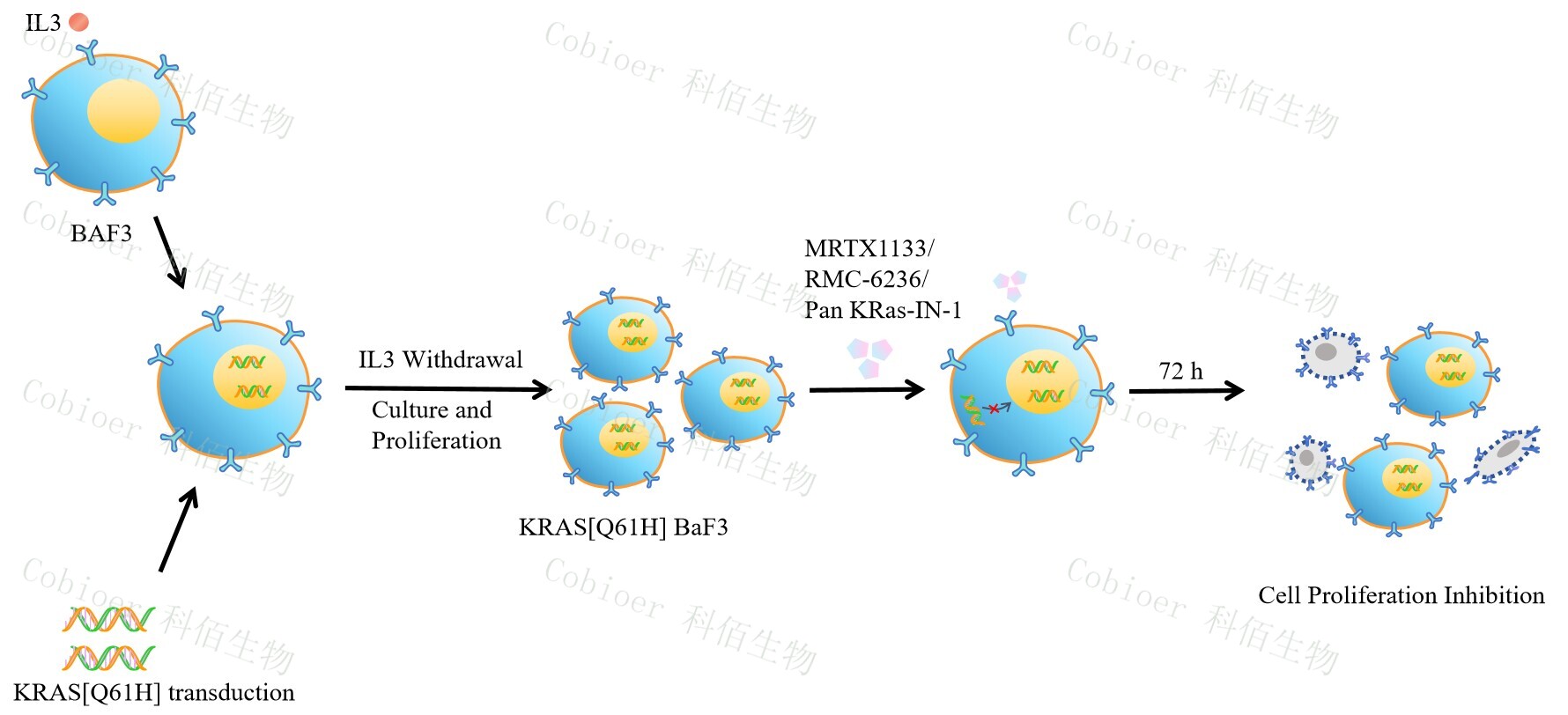 BaF3(小鼠原 B 細胞)的生長和增殖需要 IL-3 的維持。通過引入各種表達激酶的基因, 能作為 BaF3 的驅動基因,讓 BaF3 不再依賴 IL-3 而增殖,進而激酶基因成為 BaF3 增殖依 賴的驅動基因,用于評估小分子藥物對激酶的靶向抑制作用,原理及流程見下圖所示。
