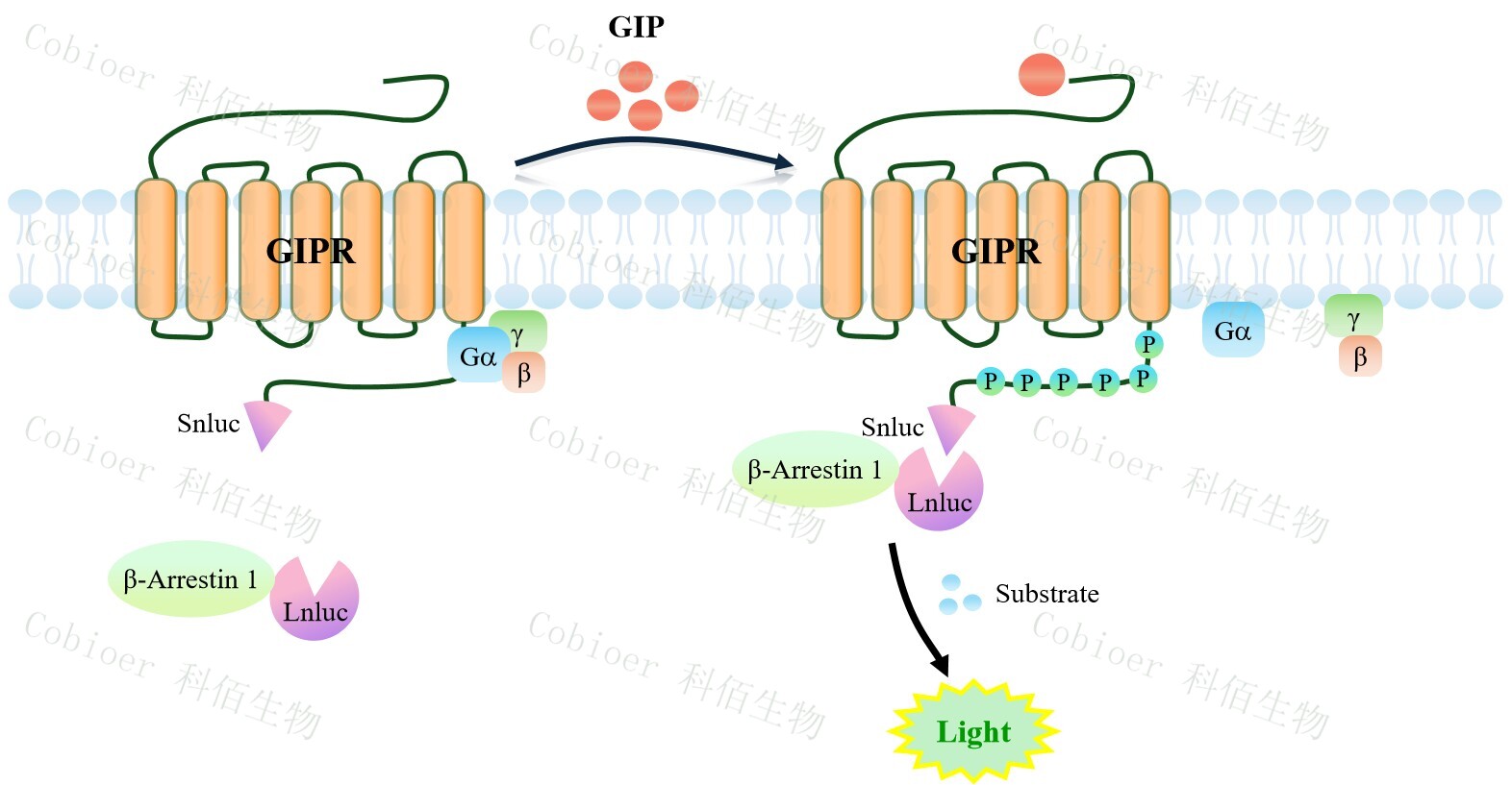 GIPR β-Arrestin 1 CHO 報告基因藥靶模型很好的模擬了體內(nèi) GIPR/β-Arrestin 1 的信號 轉導過程,原理見下圖所示。當缺乏配體刺激時,β-Arrestin 1 不與 GIPR 結合,融合β- Arrestin 1 的熒光素酶處于失活構象,當 GIPR 遭遇配體刺激時,融合熒光素酶報告基因的 β-Arrestin 1 被招募,使熒光素酶報告基因處于激活狀態(tài),加入其底物后發(fā)光信號增強。![]() Figure 1. GIPR β-Arrestin 1 CHO 細胞模型原理圖 |