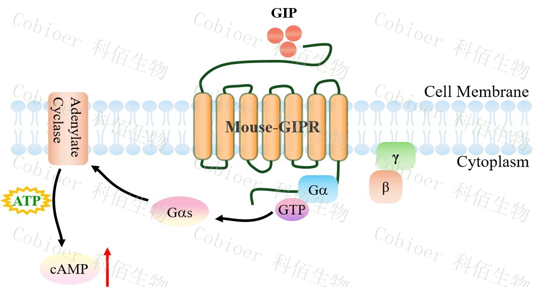 cAMP 在 G 蛋白偶聯(lián)受體(GPCR)信號轉(zhuǎn)導(dǎo)中是一種關(guān)鍵的第二信使。當(dāng)配體結(jié)合 到 GPCR,構(gòu)象發(fā)生變化,激活受體接著激活 G 蛋白,Gs 的激活導(dǎo)致腺苷酸環(huán)化酶調(diào)控 cAMP 的升高。Mouse GIPR CHO 藥靶模型很好的模擬了體內(nèi) GIPR 的信號轉(zhuǎn)導(dǎo)過程,原理 見下圖所示。![]() Figure 1. Mouse GIPR CHO 細(xì)胞模型原理圖