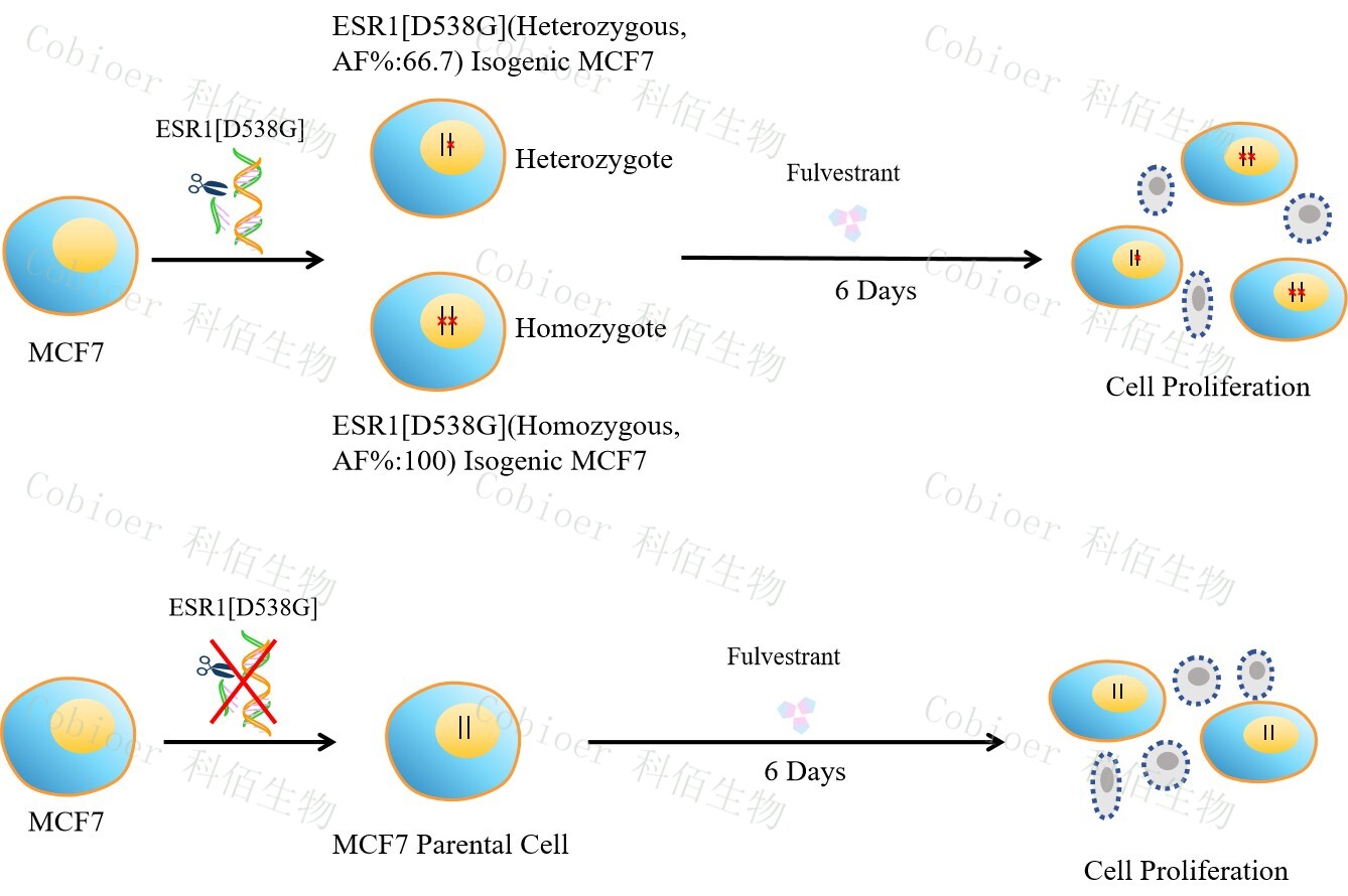 ESR1[D538G](Heterozygous,AF%66.7) Isogenic MCF7 藥靶細胞,通過基 因編輯的方式將 ESR1 的 538 位氨基酸天冬氨酸(D)突變?yōu)楦拾彼幔℅)。![]() Figure 1. ESR1[D538G](Heterozygous,AF%66.7) Isogenic MCF7 原理示意圖 |