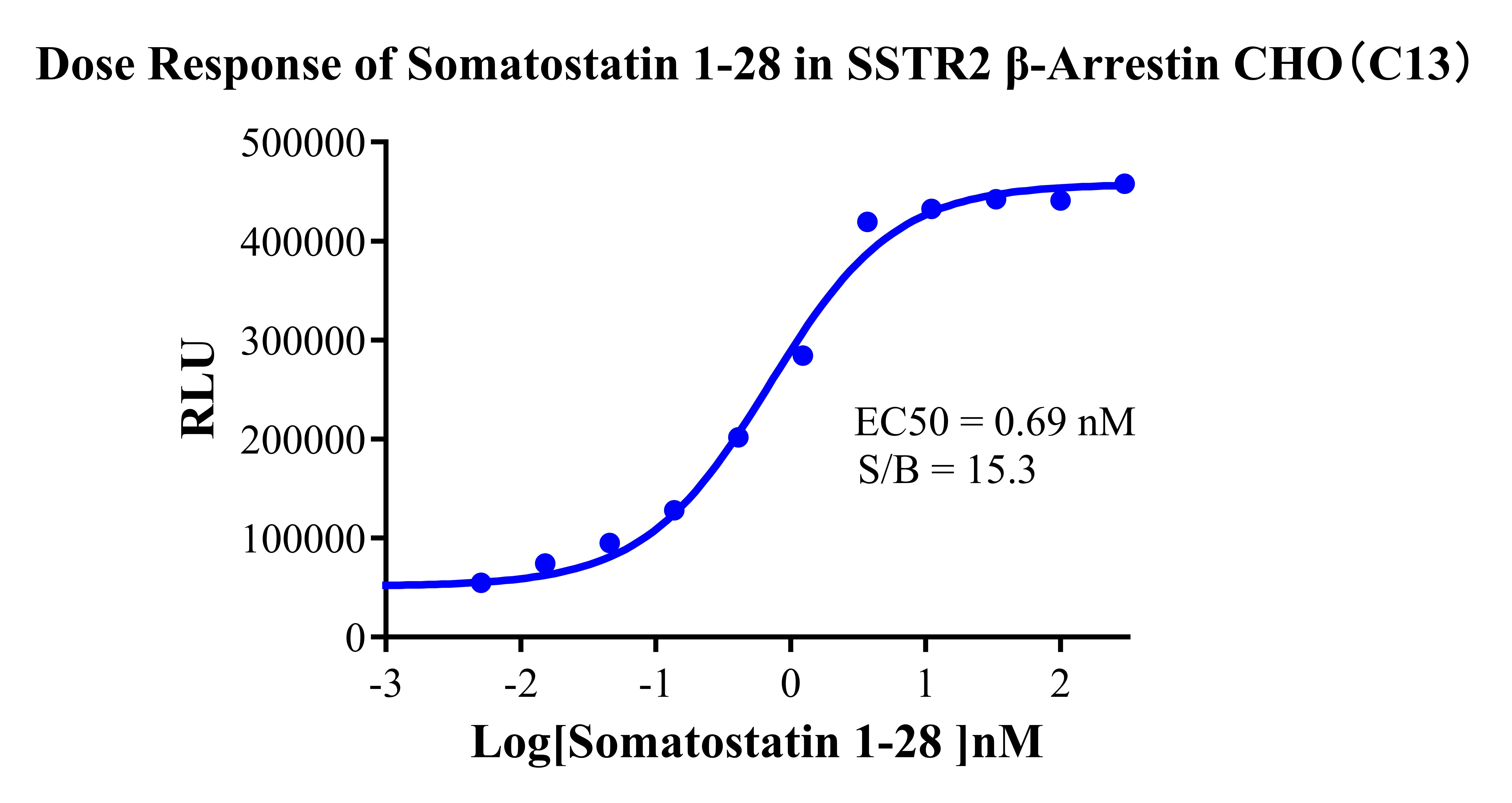 SSTR2 β-Arrestin CHO 報(bào)告基因藥靶模型很好的模擬了體內(nèi) SSTR2/β-Arrestin 的信號(hào) 轉(zhuǎn)導(dǎo)過程,原理見下圖所示。當(dāng)缺乏配體刺激時(shí),β-Arrestin 不與 SSTR2 結(jié)合,融合β- Arrestin 的熒光素酶處于失活構(gòu)象,當(dāng) SSTR2 遭遇配體刺激時(shí),融合熒光素酶報(bào)告基因的 β-Arrestin 被招募,使熒光素酶報(bào)告基因處于激活狀態(tài),加入其底物后發(fā)光信號(hào)增強(qiáng)。
