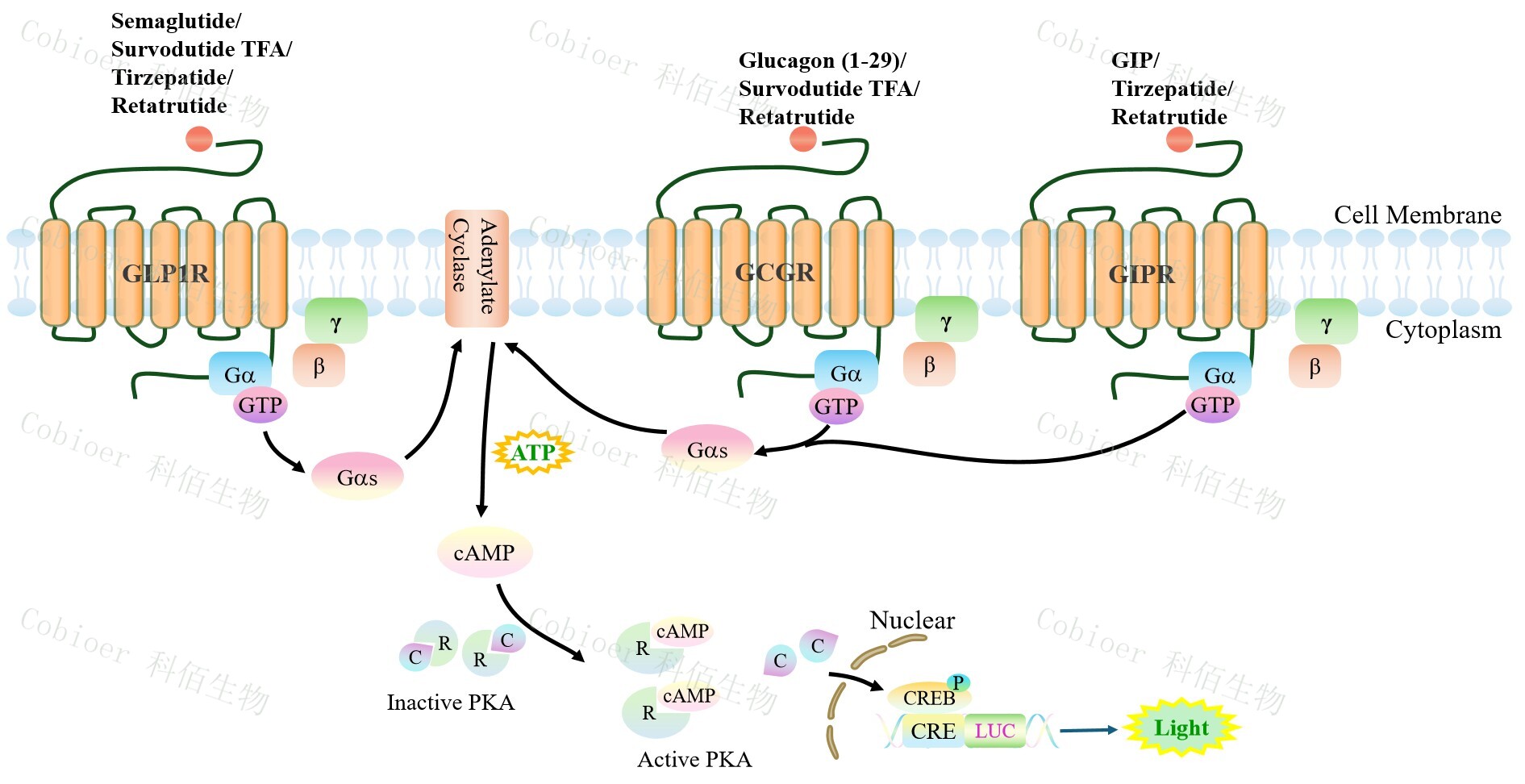 GLP1R&GCGR&GIPR Triple Reporter Cell 報(bào)告基因藥靶模型很好的模擬了體內(nèi)GLP1R&GCGR&GIPR 的信號(hào)轉(zhuǎn)導(dǎo)過(guò)程,原理見(jiàn)圖1 所