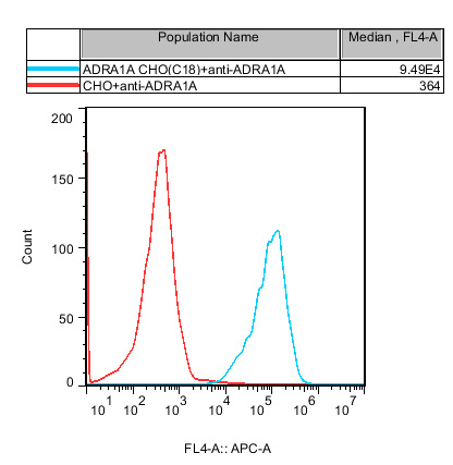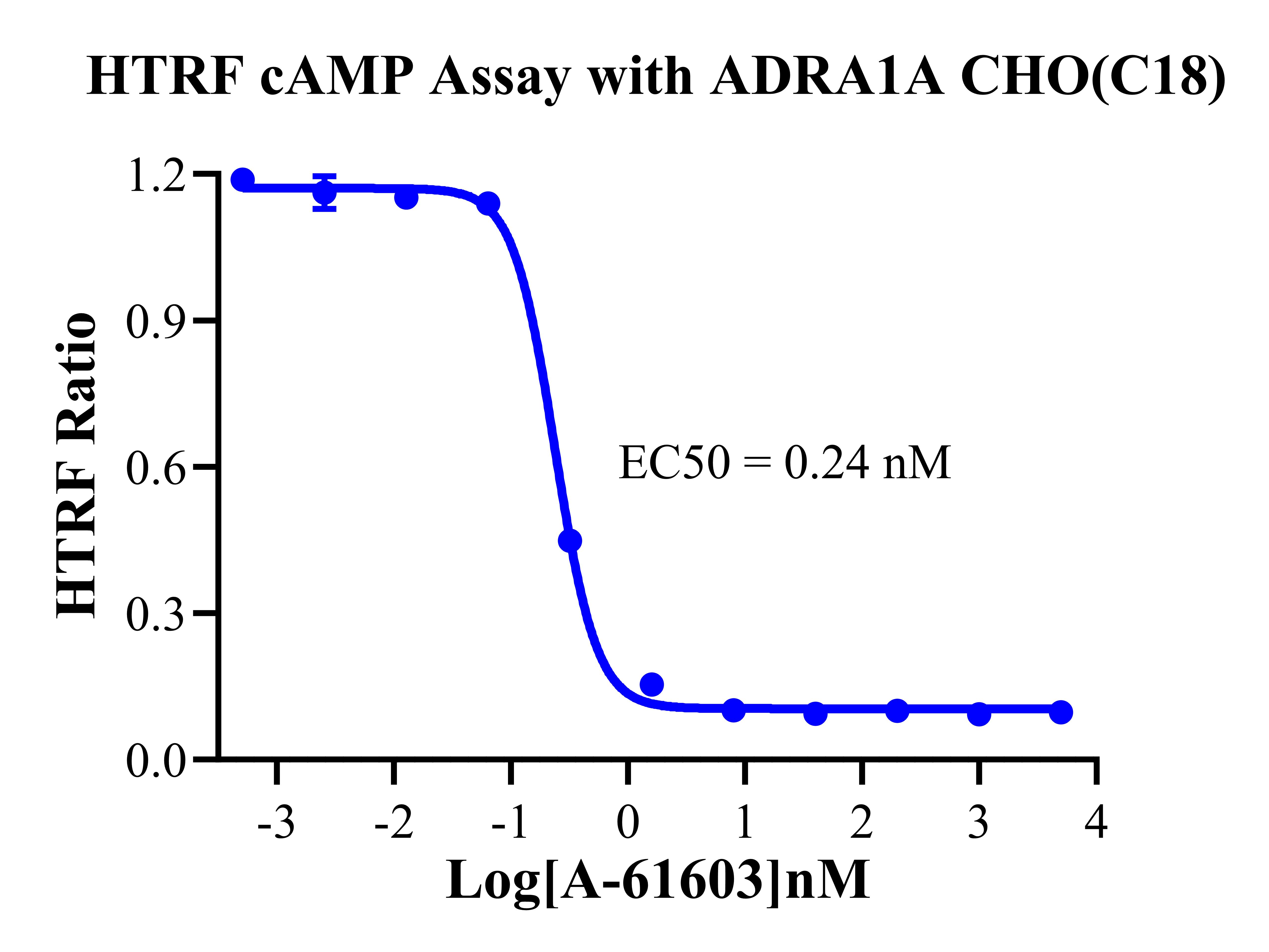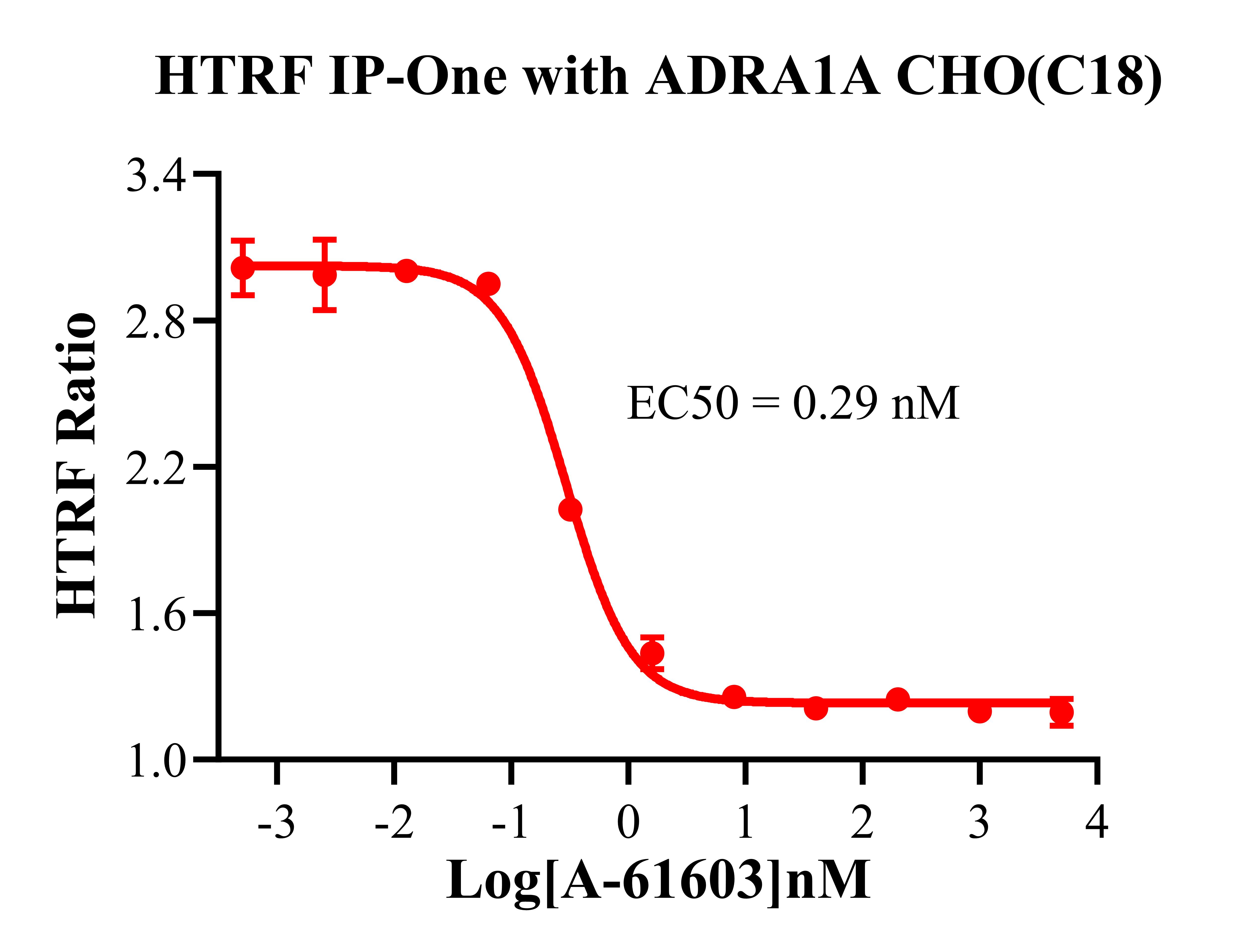 ADRA1A 還可以通過 Gq 蛋白的信號通路,調(diào)控 IP1 的升高。ADRA1A 與配體結(jié)合, 導(dǎo)致 Gαq 亞基的激活,觸發(fā) PLC-γ,從而產(chǎn)生兩個(gè)第二信使:IP3 和 DAG,它們參與細(xì)胞內(nèi)鈣動(dòng)員。由于 IP3 在代謝上不穩(wěn)定,因此測量通路激活的替代標(biāo)志物 IP1 作為檢測標(biāo)準(zhǔn)。 Figure 1. ADRA1A CHO 細(xì)胞模型原理圖
