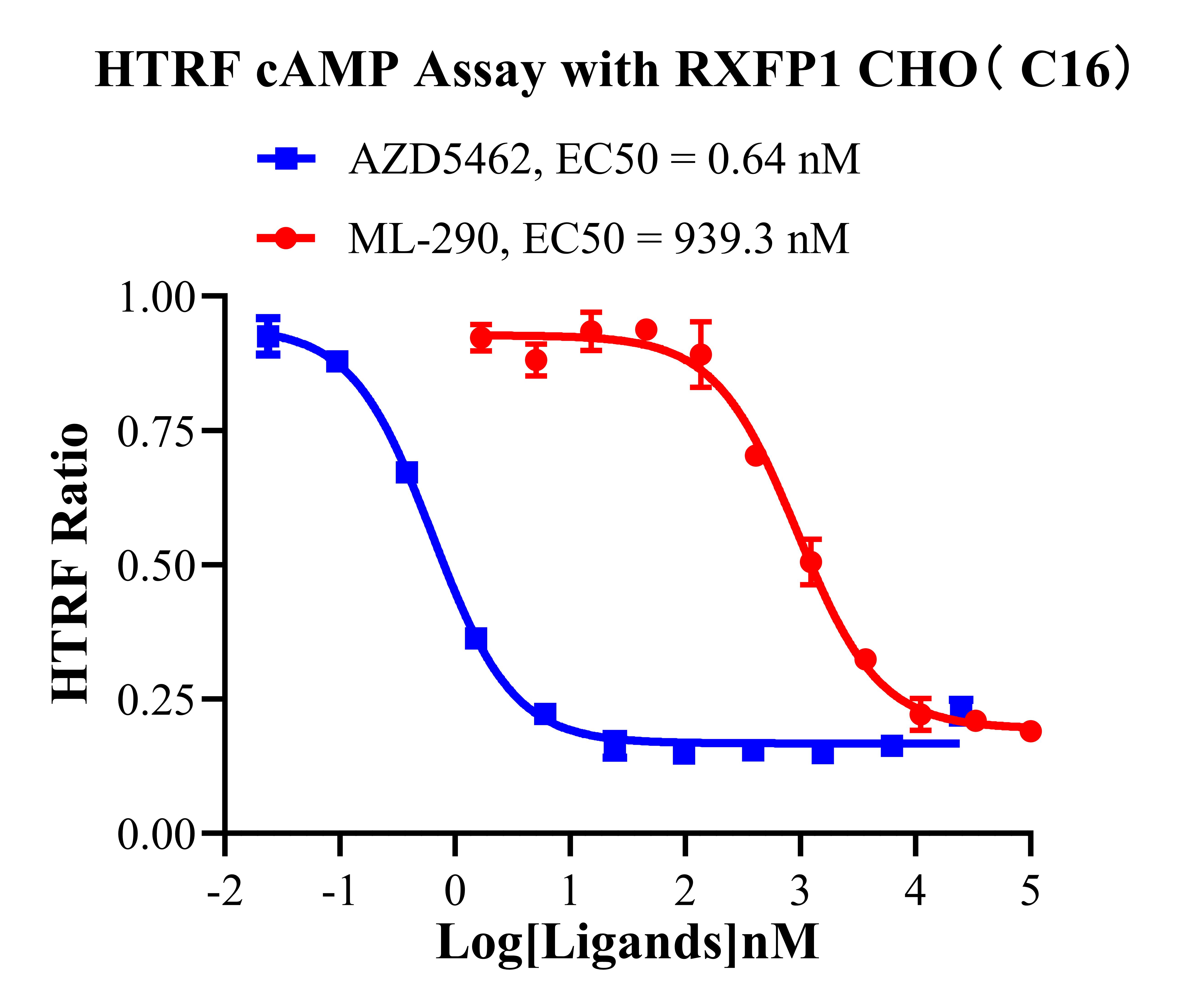 V. Representative Data![]() Figure 1. Recombinant RXFP1 CHO stably expressing RXFP1. ![]() Figure 2. HTRF CAMP Assay with RXFP1 CHO( C16). |
