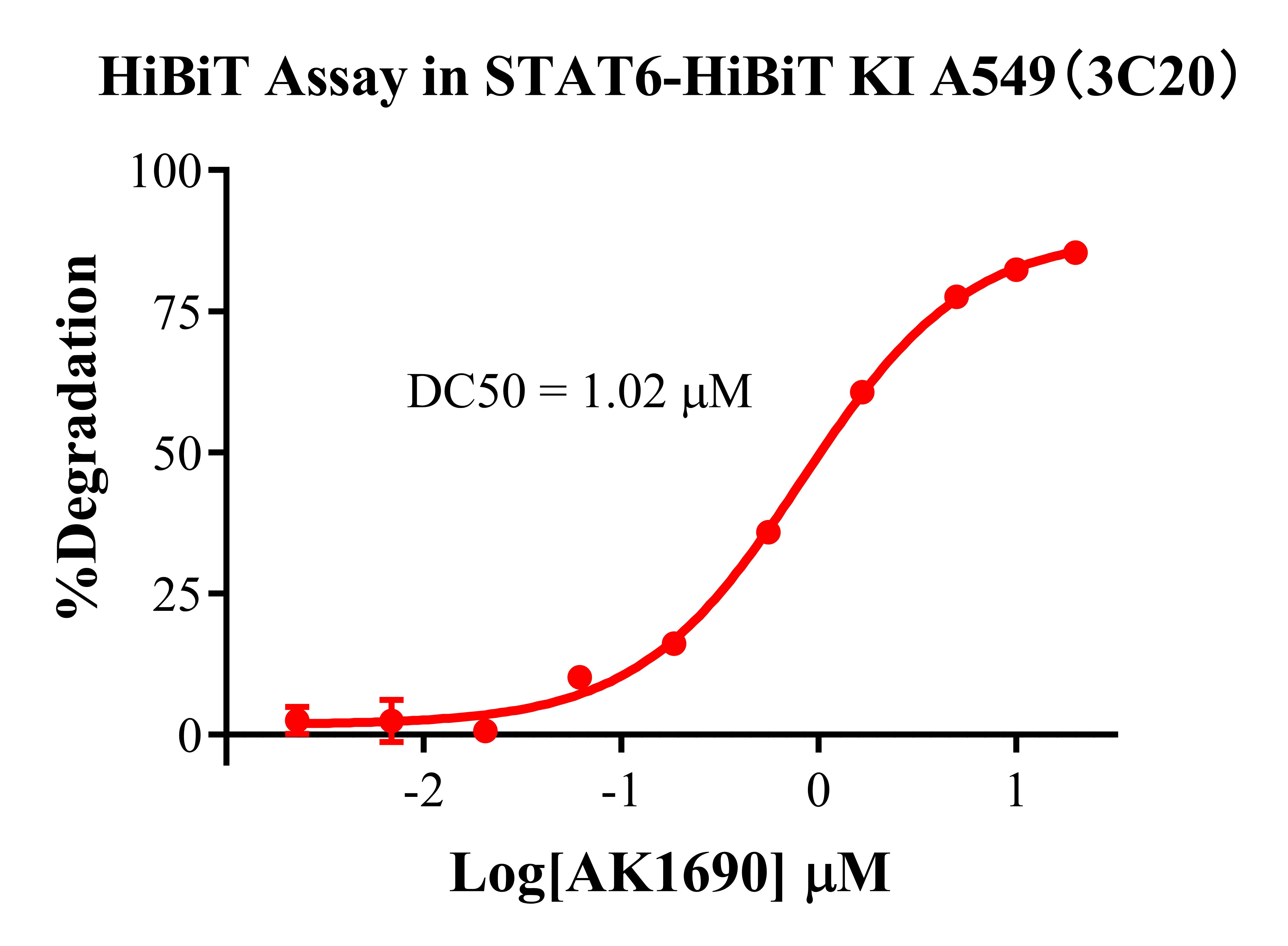 STAT6-HiBiT KI A549 報告基因細胞,通過基因編輯方式將 HiBiT 標(biāo)簽 插入細胞內(nèi)源的 STAT6 基因中。AK-1690 是一種有效和選擇性的 STAT6 PROTAC 降解劑, 原理見下圖所示。![]() Figure 1. STAT6-HiBiT KI A549 細胞模型原理圖 |