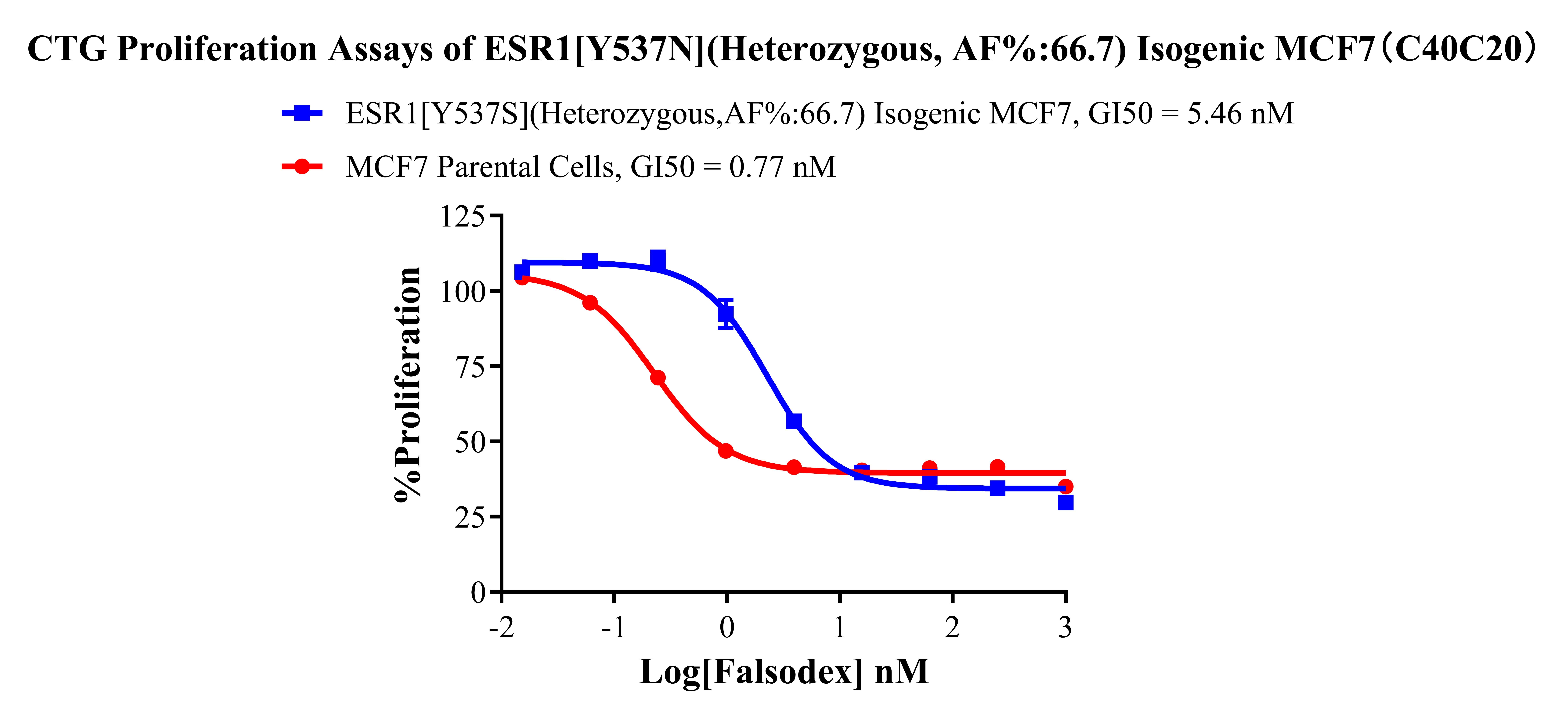 ![]() Figure 2. Sanger of ESR1[Y537N](Heterozygous,AF%:66.7)Isogenic MCF7 ![]() Figure 3. A: MCF7 Parental Cell;B:ESR1[Y537N](Heterozygous,AF%:66.7) Isogenic MCF7 通道2 藍(lán)色微滴代表ESR1[Y537N]突變陽性,通道2 綠色微滴代表該位點(diǎn)為陰性野生型 ![]() Figure 4. CTG Proliferation Assays of ESR1 [Y537N](Heterozygous, AF%:66.7) 1sogenic MCF7(C40C20). |