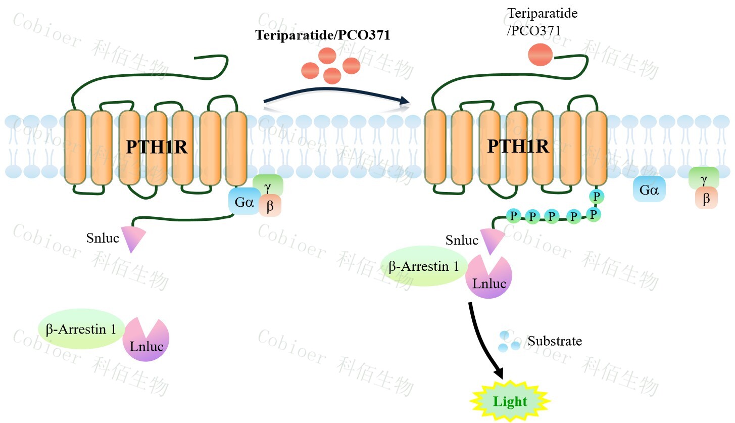 PTH1R β-Arrestin 1 CHO 報(bào)告基因藥靶模型很好的模擬了體內(nèi) PTH1R/β-Arrestin 1 的信號(hào)轉(zhuǎn)導(dǎo)過(guò)程,原理見(jiàn)下圖所示。當(dāng)缺乏配體刺激時(shí),β-Arrestin 1 不與 PTH1R 結(jié)合,融合β- Arrestin 1 的熒光素酶處于失活構(gòu)象,當(dāng) PTH1R 遭遇配體刺激時(shí),融合熒光素酶報(bào)告基因 的β-Arrestin 1 被招募,使熒光素酶報(bào)告基因處于激活狀態(tài),加入其底物后發(fā)光信號(hào)增強(qiáng)。![]() Figure 1. PTH1R β-Arrestin 1 CHO 細(xì)胞模型原理圖 |