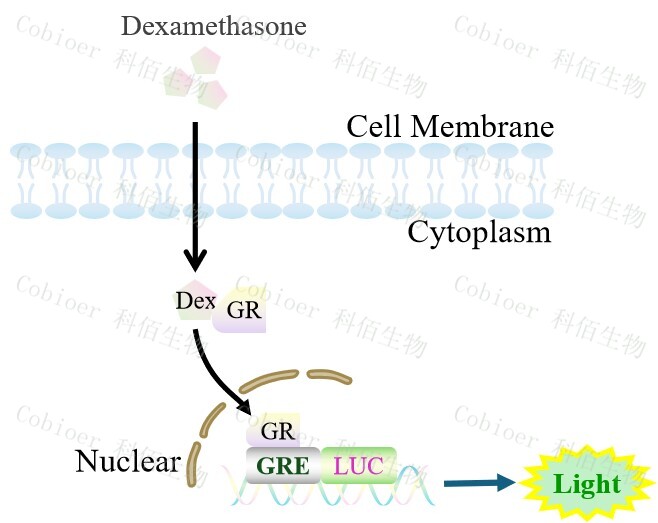 GRE-Luc HEK293 報告基因細胞,是由 GRE 調(diào)控并表達 Luc 熒光素酶 報告基因的 HEK293 細胞。Dexamethasone (Hexadecadrol,地塞米松)是糖皮質(zhì)激素受體 (Glucocorticoid Receptor)激動劑、凋亡誘導劑,原理見下圖所示。