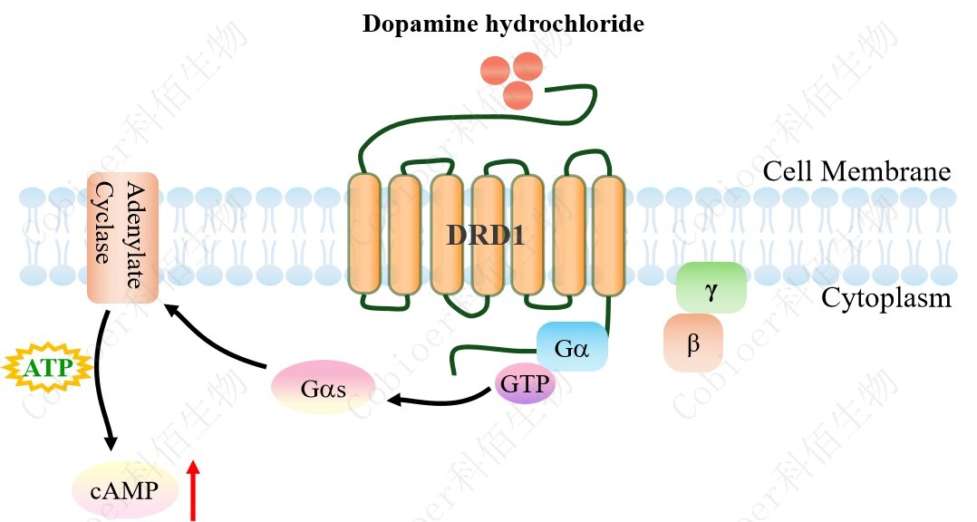 | 多巴胺(DA)是一種主要的兒茶酚胺神經(jīng)遞質,它與多巴胺受體(DRs)結合,因此 在中樞神經(jīng)系統(tǒng)(CNS)中起著重要作用,包括睡眠、工作記憶、情緒、學習等。DRs 是 由 DRD1、DRD2、DRD3、DRD4 和 DRD5 組成的 G 蛋白偶聯(lián)受體,根據(jù)它們對腺苷酸環(huán) 化酶(AC)活性的不同調節(jié)作用,分為 D1 樣受體(DRD1 和 DRD5)和 D2 樣受體(DRD 2、DRD3 和 DRD4)。 D1 樣受體與 Gs 偶聯(lián),其結合激活腺苷酸環(huán)化酶,增加 cAMP/PKA 級聯(lián)反應的激活。 由 D1 樣受體激活的信號級聯(lián)反應也可以通過調節(jié)轉錄對細胞功能產(chǎn)生長期影響。例如,D 1 樣受體激動劑會增加 cAMP 水平和 CREB 在 Ser133 位點的磷酸化,隨后調節(jié)了許多對各 種精神疾病的重要基因的轉錄。相關研究表明,一些 D1 激動劑的行為效應與 cAMP/PKA 信號傳導無關,而是涉及非 cAMP 介導的信號傳導,包括 PLC 介導的鈣升高。DA 可通過 作用于其受體來調節(jié)不同免疫細胞的激活和趨化性,從而充當免疫系統(tǒng)的重要調節(jié)劑。DR D1 是最豐富的多巴胺受體,在中樞神經(jīng)系統(tǒng)(CNS)中高度表達。DRD1 是治療許多 CNS 疾病的具有吸引力的靶點,還包括許多與認知能力下降相關的疾病。 |