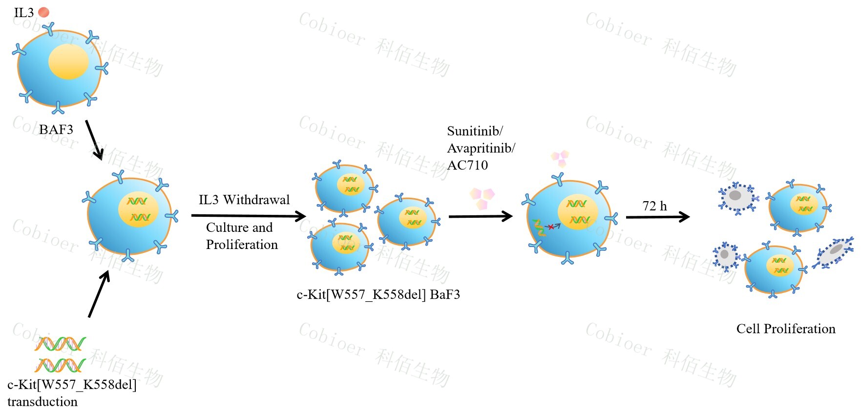 c-Kit[W557_K558del] BaF3 藥 靶 細(xì) 胞 , 通過轉(zhuǎn)導(dǎo)缺失狀態(tài)的 c-Kit[W557_K558del] 基因到 BaF3 細(xì)胞系中,穩(wěn)定表達(dá)人缺失形態(tài)下的 c-Kit[W557_K558del]基因。 BaF3(小鼠原 B 細(xì)胞)的生長和增殖需要 IL-3 的維持。通過引入各種表達(dá)激酶的基因, 能作為 BaF3 的驅(qū)動(dòng)基因,讓 BaF3 不再依賴 IL-3 而增殖,進(jìn)而激酶基因成為 BaF3 增殖依賴的驅(qū)動(dòng)基因,用于評估小分子藥物對激酶的靶向抑制作用,原理及流程見下圖所示。