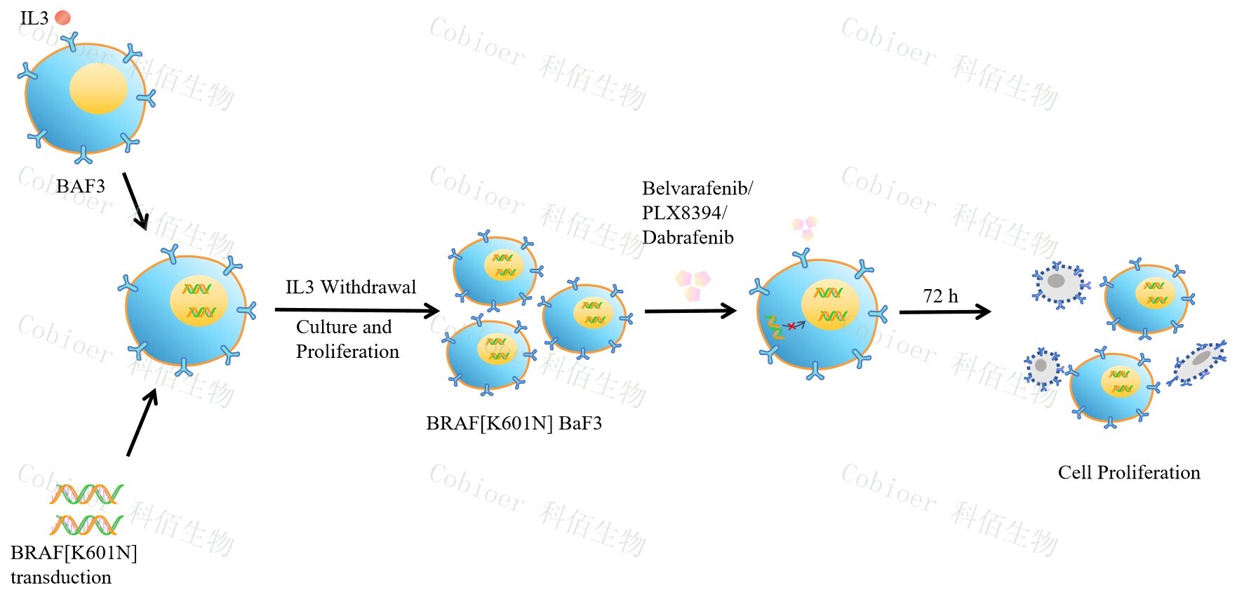 BaF3(小鼠原 B 細(xì)胞)的生長(zhǎng)和增殖需要 IL-3 的維持。通過(guò)引入各種表達(dá)激酶的基因, 能作為 BaF3 的驅(qū)動(dòng)基因,讓 BaF3 不再依賴 IL-3 而增殖,進(jìn)而激酶基因成為 BaF3 增殖依 賴的驅(qū)動(dòng)基因,用于評(píng)估小分子藥物對(duì)激酶的靶向抑制作用,原理及流程見(jiàn)下圖所示。![]() Figure 1. BRAF[K601N] BaF3 細(xì)胞的構(gòu)建原理圖 |