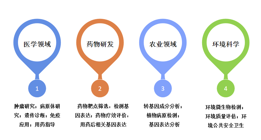 實(shí)時(shí)熒光定量PCR具有靈敏度高、特異性強(qiáng)、快速高效的特點(diǎn),廣泛應(yīng)用于生物醫(yī)藥、臨床診斷、農(nóng)業(yè)、環(huán)境科學(xué)等多個(gè)領(lǐng)域,常用于檢測(cè)基因表達(dá)、基因變異、轉(zhuǎn)基因等。