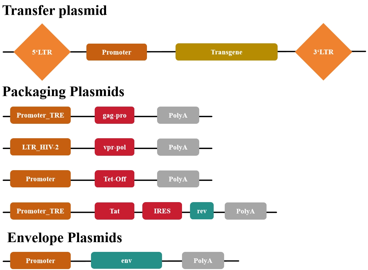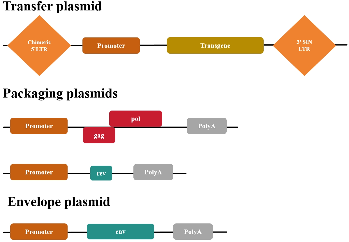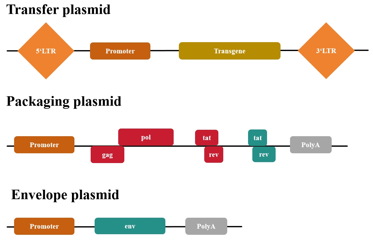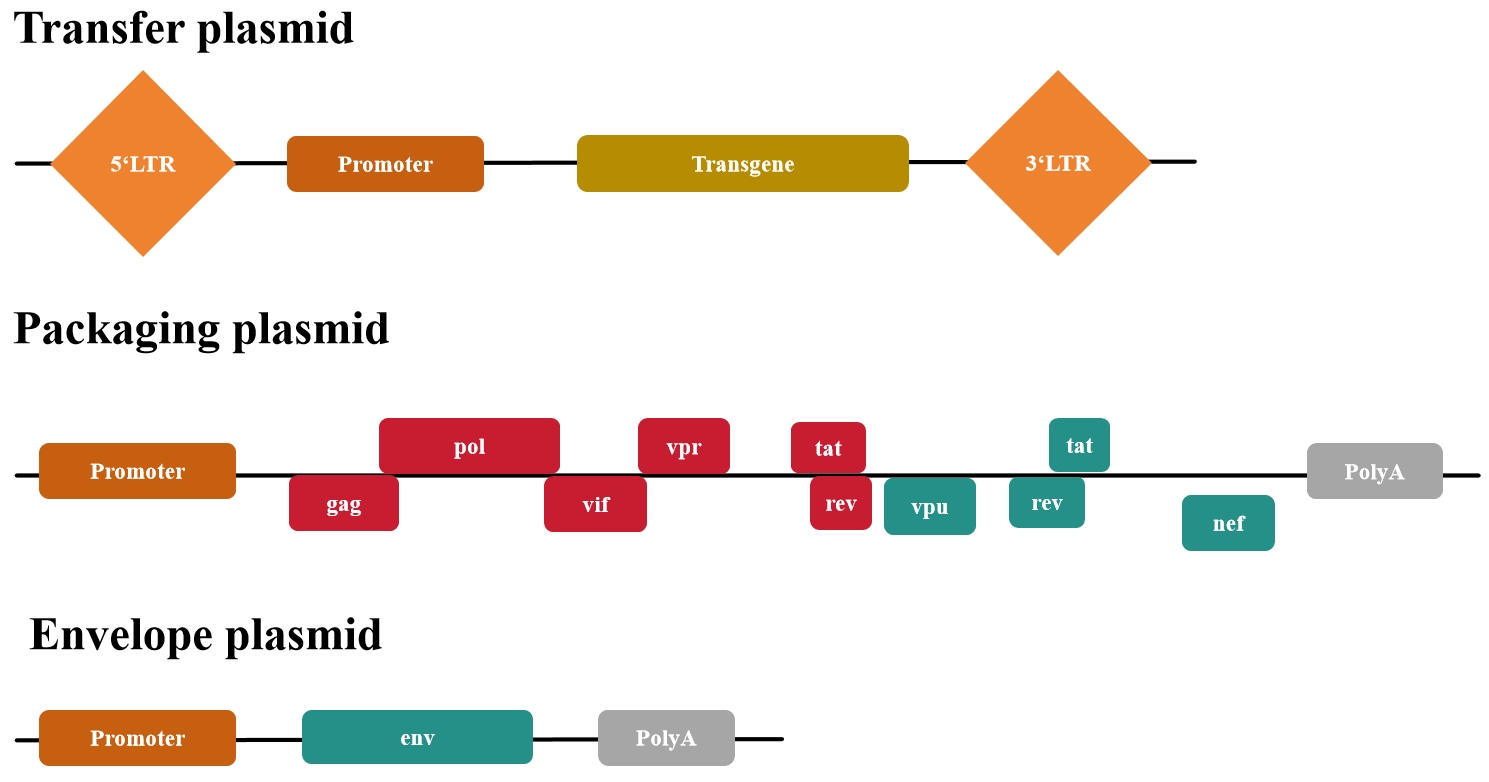 第一代慢病毒質(zhì)粒缺乏安全性改進(jìn)以及無(wú)法生產(chǎn)具有復(fù)制能力的慢病毒(即產(chǎn)生能夠感染細(xì)胞并進(jìn)一步自我復(fù)制的病毒顆粒),基本已經(jīng)廢棄使用了。