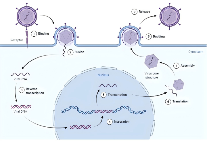 慢病毒(LV)是一種有包膜的病毒,最常見(jiàn)的是VSV-G,它通過(guò)與特定的細(xì)胞表面蛋白(比如LDLR)結(jié)合,隨后進(jìn)行膜融合進(jìn)入細(xì)胞,將含有其遺傳信息的病毒RNA注入細(xì)胞質(zhì)。這種單鏈病毒RNA通過(guò)逆轉(zhuǎn)錄轉(zhuǎn)化為DNA。病毒DNA進(jìn)入細(xì)胞核,并通過(guò)病毒整合酶整合到宿主細(xì)胞基因組中。