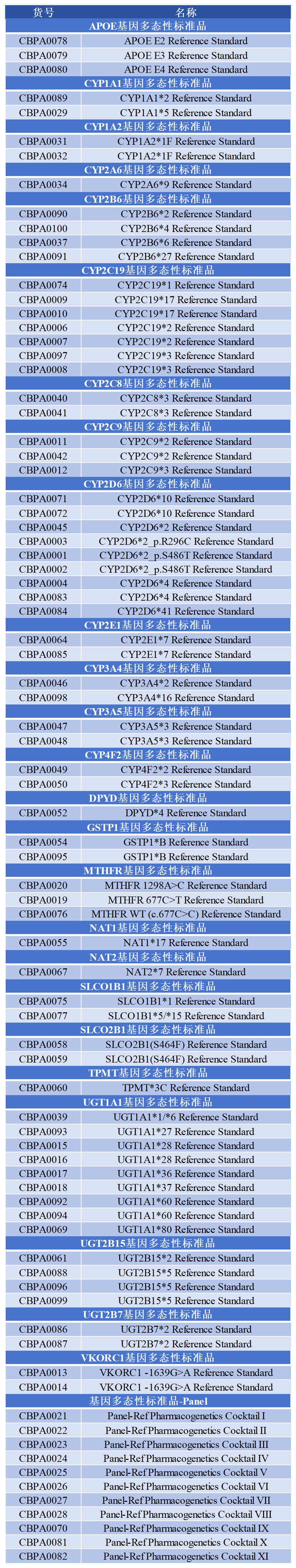 科佰生物目前可提供近百種用藥指導(dǎo)的質(zhì)控單品及混合質(zhì)控盤(pán),涵蓋APOE、CYP1A1、CYP2A6、CYP2B6、CYP2C19、CYP2C8、CYP2C9、CYCP2D6、CYP2E1、CYP3A4、CYP3A5、CYP4F2、DPYD、GSTP1、MTHFR、NAT1、NAT2、SLCO1B1、TPMT、UGT1A1、UGT2B15、UGT2B7、VKORC1等多個(gè)藥物代謝基因,可在全流程對(duì)檢測(cè)過(guò)程進(jìn)行監(jiān)控,幫助實(shí)現(xiàn)個(gè)體化用藥基因檢測(cè)的精準(zhǔn)性。