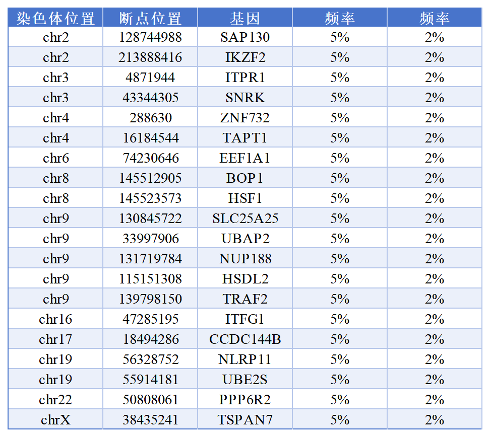 目前檢測ISA的方法有LM-PCR、NGS、單細胞測序等,為了保證檢測的準確性,科佰生物開發(fā)了一系列慢病毒整合位點標準品供檢測機構使用,作為品質衡量的標尺對檢測能力進行判別。在前文 慢病毒整合位點標準品強勢來襲一文中,已對單克隆多插入位點、單克隆單插入位點性染色體插入位點 做了產(chǎn)品的說明及數(shù)據(jù)展示。近期科佰推出了5%  2% 整合頻率的慢病毒多克隆多整合位點參考品,由多個單克隆整合位點產(chǎn)品混合而來,覆蓋20個插入位點,分別來自11個不同染色體上的20個基因,如下表所示