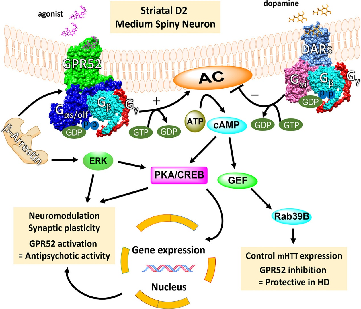 GPR52 是一種高度進(jìn)化保守、腦部富集的G 蛋白偶聯(lián)受體 (GPCR),其與非孤兒型GPCR的序列同源性低于20%。由于其內(nèi)源性配體未知且與非孤兒型GPCR的結(jié)構(gòu)相似度低,GPR52的生理功能尚未得到充分闡明。然而,GPR52在cAMP依賴性細(xì)胞反應(yīng)中的功能作用已逐漸明晰,有文獻(xiàn)揭露了GPR52的cAMP依賴性信號通路以及在伏隔核中等棘神經(jīng)元(MSNs)中與其他功能蛋白的相互作用。GPR52與Gs或Golf偶聯(lián),促進(jìn)腺苷酸環(huán)化酶(AC)活性,提高cAMP水平,進(jìn)而誘導(dǎo)蛋白激酶A(PKA)激活和cAMP反應(yīng)元件結(jié)合蛋白(CREB)的表達(dá),從而調(diào)節(jié)細(xì)胞反應(yīng)和基因表達(dá)。(此外,GPR52還能招募并相互作用于β-arrestins,這可能會導(dǎo)致細(xì)胞外信號調(diào)節(jié)激酶(ERK)磷酸化信號的激活。相比之下,被激活的多巴胺受體(DARs),如 D2/D3 受體(D2R/D3R),與 Gi/o 蛋白偶聯(lián),抑制腺苷酸環(huán)化酶(AC)的活性,從而導(dǎo)致環(huán)磷酸腺苷(cAMP)的生成減少。GPR52 和 D2R 分別在激活和減少 cAMP 信號傳導(dǎo)方面的作用相反,這支持了 GPR52 激動劑能夠阻止 D2R 信號傳導(dǎo)的概念,從而在神經(jīng)精神疾病中產(chǎn)生類似抗精神病藥物的效果。