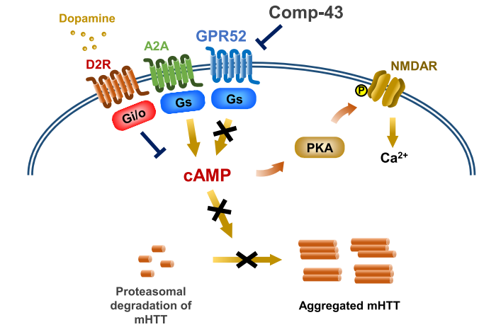 還有文獻(xiàn)報道關(guān)于用于治療亨廷頓病的 GPR52 信號傳導(dǎo)模型。在紋狀體中,GPR52 在表達(dá)多巴胺 D2 和腺苷 A2a 受體的紋狀體蒼白球神經(jīng)元中表達(dá)。GPR52 拮抗劑 Comp-43 會導(dǎo)致突變亨廷頓蛋白(mHTT)的蛋白酶體降解。相反,通過增加細(xì)胞內(nèi) cAMP 激活 GPR52 會將 mHTT 運(yùn)輸?shù)絻?nèi)質(zhì)網(wǎng)并防止其降解。GPR52 調(diào)節(jié)多巴胺能和谷氨酸能傳遞,并通過 NMDA 受體控制運(yùn)動行為以及精神癥狀。