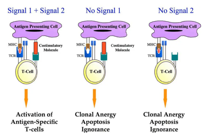 但僅有信號1無法有效激活T細胞的免疫反應,還需要足夠的共刺激信號(信號2)。信號2不是抗原特異性的,而是通過抗原呈遞細胞上表達的共刺激信號分子和T細胞的相互作用而實現(xiàn)的。共刺激信號對于T細胞的增殖,分化和存活是必要的。如果沒有共刺激信號,可能會出現(xiàn)T細胞無應答/應答低下,細胞死亡或者會有免疫耐受的情況。