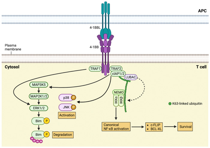 4-1BB的配體是4-1BBL(也稱為TNFSF9或CD137L)。4-1BBL是TNF超家族的II型膜蛋白。在與抗原呈遞細胞(APC)上的 4-1BBL 相互作用后,4-1BB 信號傳導首先將TRAF1和TRAF2與cIAP1和cIAP2一起募集到位于 4-1BB 細胞質尾部的 TRAF 結合基序,形成 4-1BB 信號復合物。TRAF1 和 TRAF2 通過 TRAF1 刺激 ERK1/2 活性導致 ERK1/2 激活。ERK1/2 的激活還誘導促細胞凋亡蛋白 Bim 的磷酸化,使Bim的蛋白酶體降解,進而促進了 T 細胞存活。在 4-1BB 誘導的 NF-κB 激活的背景下,TRAF2-cIAP 復合物啟動 NF-κB 通路。IKK 復合物由三個亞基組成:兩個激酶 IKKα 和 IKKβ,以及調節(jié)亞基 NF-κB 必需調節(jié)劑 (NEMO;也稱為 IKKγ)。NF-κB誘導BCL-XL、BCL-2和c-FLIP的轉錄,刺激IL-2、IL-4和IFN-γ的表達,促進T細胞的存活和細胞毒性活性。此外,TRAF2 募集促進 JNK 和 p38 MAPK 通路的激活。JNK 易位到細胞核中,與轉錄因子 JUN 和 ATF2 相互作用,導致 T 細胞產生 IL-2、IL-4 和 IFN-γ。