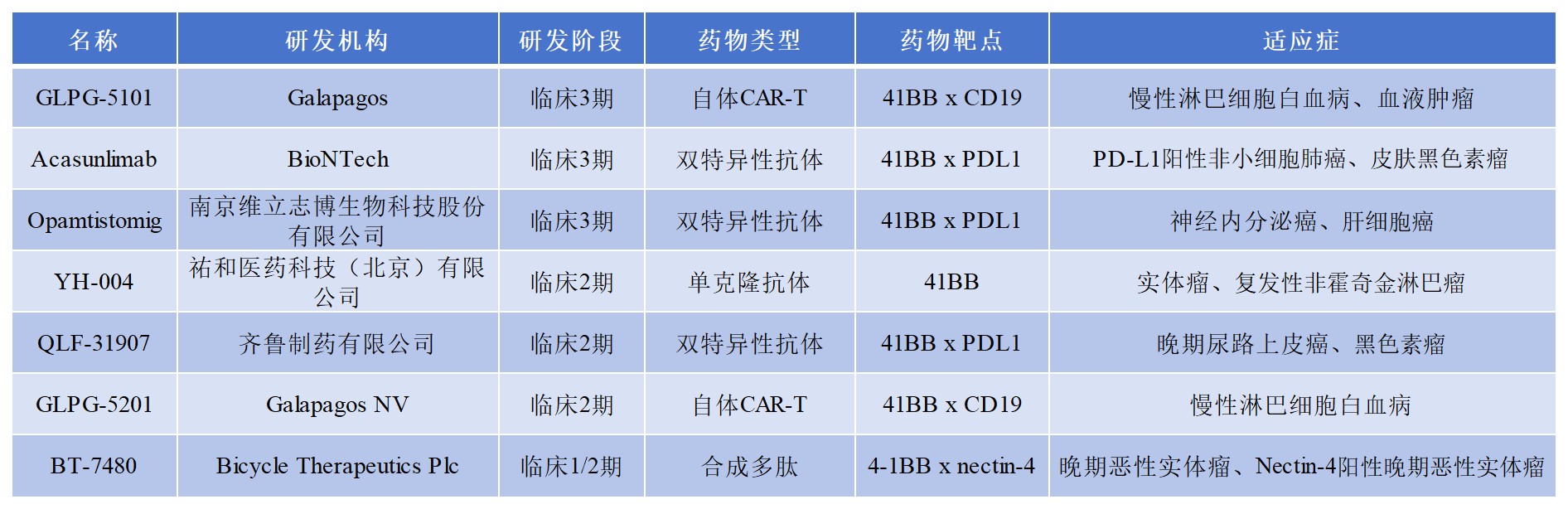 關于4-1BB,第一代藥物研發(fā)主要聚焦于4-1BB激動型抗體類藥物:2005年百時美施貴寶(BMS)公司首次開發(fā)的抗體藥物urelumab (BMS-663513)但后續(xù)由于肝毒性的不良事件而終止開發(fā);第二款4-1BB的抗體藥物是由輝瑞開發(fā)的utomilumab (PF-05082566),于2011年進入臨床試驗,但是它的療效很有限,最終也停止在臨床開發(fā)。第二代4-1BB激動型藥物主要分為兩大類:IgG類型(單抗結構)以及雙/多抗的4-1BB激動型藥物。