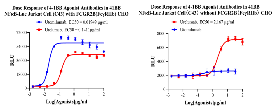 為助力4-1BB靶點藥物研發(fā),我們開發(fā)了41BB/CHO、41BB/HEK293、41BB/NFκB-Luc/HEK293、41BB/NFκB-Luc/Jurkat和4-1BBL CHO細胞篩選模型,產品驗證結果如下:
