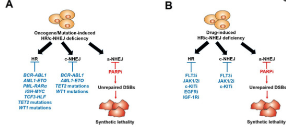 “合成致死”是指兩個非致死基因同時被抑制,導(dǎo)致細(xì)胞死亡的現(xiàn)象。當(dāng)兩個基因同時失活導(dǎo)致細(xì)胞死亡,但任一基因中的單獨(dú)失活都是無明顯毒性。在發(fā)生突變失活的腫瘤中,通過抑制其合成致死配對基因,可獲得腫瘤選擇性殺死。