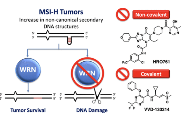 國際頂級期刊之一Nature于去年同一天上線了兩篇關(guān)于WRN(Werner綜合征RecQ解旋酶)抑制劑的文章,其中一篇是關(guān)于Novartis的HRO761的發(fā)現(xiàn)過程,另一篇介紹了拜耳(Bayer)旗下Vividion Therapeutics 公司的VVD-133214 (又叫RO7589831)的發(fā)現(xiàn)過程。這些文章重燃了醫(yī)藥行業(yè)對“WRN”這個合成致死靶點(diǎn)的關(guān)注。