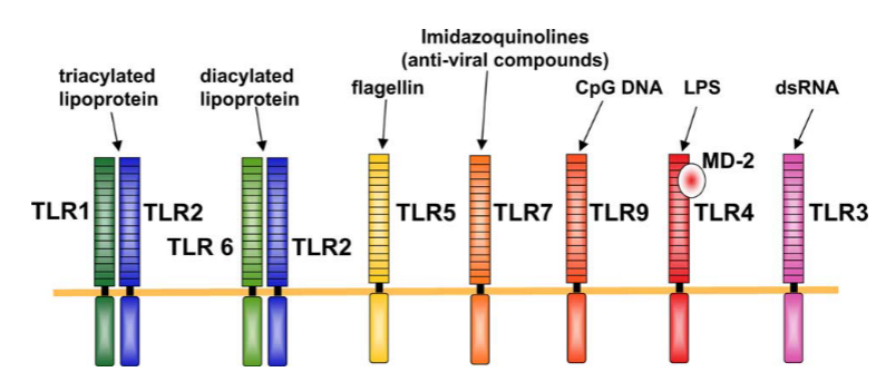Toll樣受體(Toll like receptors,簡稱TLRs)是一類介導(dǎo)炎癥先天性免疫的受體。TLRs是最早發(fā)現(xiàn)和最具特征性的模式識別受體,廣泛分布在巨噬細(xì)胞、樹突狀細(xì)胞免疫細(xì)胞中,另外,還存在于像心肌細(xì)胞這樣的組織細(xì)胞中。