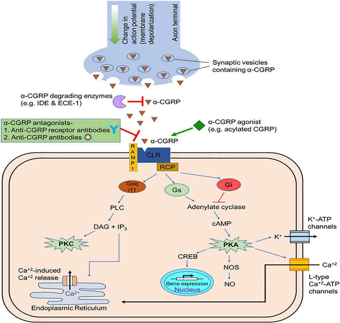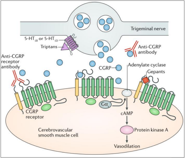 降鈣素基因相關(guān)肽(calcitonin gene-related peptid,CGRP)是一個含有37個氨基酸殘基的感覺神經(jīng)源性多肽,分為α-CGRP和β-CGRP兩個亞型,廣泛分布于中樞神經(jīng)系統(tǒng)(主要是三叉神經(jīng)血管系統(tǒng)、丘腦和小腦)。CGRP是一種強(qiáng)效的血管擴(kuò)張劑,它主要由感覺神經(jīng)(如三叉神經(jīng))釋放。CGRP釋放后與腦血管平滑肌細(xì)胞表面的CGRP受體結(jié)合,引起腦血管擴(kuò)張。CGRP受體的結(jié)構(gòu)主要包括:降鈣素受體樣受體(CALCRL)、活性修飾蛋白受體(RAMP)及結(jié)構(gòu)蛋白受體(RCP)。CGRP受體復(fù)合物是一種G蛋白偶聯(lián)受體,通過激活蛋白激酶A系統(tǒng),參與疼痛信息的病理調(diào)控過程。