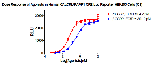 針對CGRP靶點藥物開發(fā)研究的需求,科佰生物開發(fā)了CALCRL/RAMP1/CRE-Luc/HEK293藥篩細(xì)胞模型,歡迎來電咨詢。部分?jǐn)?shù)據(jù)展示如下: