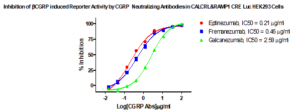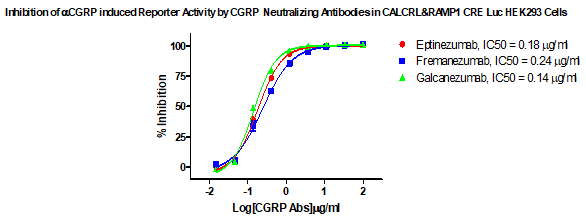 Figure 4. Inhibtion of αCGRP induced Reporter Activity by CGRP Neutralizing Antibodies in CALCRL&RAMP1 CRE Luc HEK293 Cells.