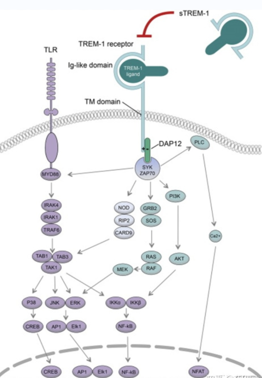 在TREM1被激活后,與其相關(guān)的DAP12蛋白含有ITAMs的胞質(zhì)部分在其酪氨酸殘基上磷酸化,然后與ZAP70和SYK蛋白結(jié)合,使其磷酸化。SYK促進(jìn)包含Cbl、SOS和GRB2的適應(yīng)性復(fù)合物的招募和酪氨酸磷酸化,從而通過PI3K、PLC-Gamma和ERK途徑導(dǎo)致下游信號轉(zhuǎn)導(dǎo)。這些途徑誘導(dǎo)Ca2 +動員,重新排列肌動蛋白細(xì)胞骨架和激活轉(zhuǎn)錄因子,如Elk1、NFA、AP1、c-Fos、c-Jun和Nf-κB,這些轉(zhuǎn)錄因子編碼促炎癥細(xì)胞因子、趨化因子和細(xì)胞表面分子。此外,TREM1誘導(dǎo)的PI3K和ERK途徑的激活可以通過滅活促凋亡因子來促進(jìn)線粒體的完整性和細(xì)胞生存:BID、BAD和BAX,并抑制CytoC從線粒體釋放。