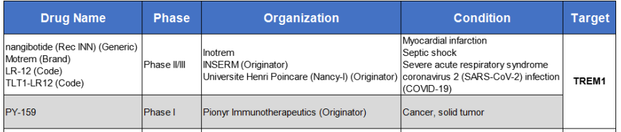 TREM1作為一個(gè)新靶點(diǎn),全球范圍內(nèi)披露的研發(fā)管線不多,針對TREM1靶點(diǎn)有2款產(chǎn)品進(jìn)入臨床,1款產(chǎn)品即將進(jìn)入臨床(Celsius公司的CEL383,適應(yīng)癥為炎癥性腸?。?。適應(yīng)癥主要為急性感染性疾病、自身免疫性疾病和癌癥。目前TREM1靶點(diǎn)針對癌癥的臨床前藥物比較活躍的是nangibotide(處于臨床II/III期)及PY-159(處于臨床I期)。其中較引人關(guān)注的是Pionyr Immunotherapeutics公司的TREM1抗體PY159正在與帕博利珠單抗聯(lián)合用于晚期實(shí)體瘤患者的Ia/Ib期研究。PY159 是一種人源化單克隆抗體,能特異性地結(jié)合表達(dá)在髓系細(xì)胞上的TREM1,并通過交聯(lián)TREM1/DAP12 復(fù)合物誘導(dǎo)下游信號傳導(dǎo),發(fā)揮激動劑的作用。2023年 ASCO報(bào)道的 PY159 的用于冷腫瘤相關(guān)瘤種的I期的臨床研究,結(jié)果顯示總體安全性可控,療效方面 ORR 為 6%,DCR 為 33%,其中胰腺癌患者展現(xiàn)出較好的療效。總的來說,TREM1靶點(diǎn)藥物的作用機(jī)理和效果還不是非常明確,正在研發(fā)的藥物療效也不是很出色,未來前景還值得繼續(xù)觀察。