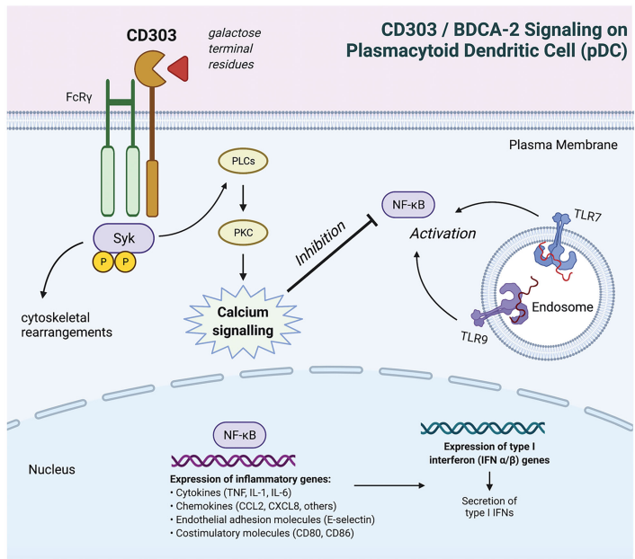 BDCA-2 (blood DC antigen 2血液樹(shù)突狀細(xì)胞抗原2)又叫CLEC4C或CD303,是人類pDCs特有的II型c型凝集素受體(CLR),與TLR-7/9協(xié)同識(shí)別微生物和協(xié)調(diào)炎癥免疫反應(yīng)。BDCA-2是一種可溶性跨膜糖蛋白,由聚集在12號(hào)染色體上的c型凝集素編碼基因編碼,包括KLRG1和CLEC4A。與其他CLR類似,BDCA-2具有單個(gè)胞外碳水化合物識(shí)別結(jié)構(gòu)域,并且在其短細(xì)胞質(zhì)尾部缺乏固有的信號(hào)基序。BDCA-2選擇性地與IgG分子上的半乳糖端聚糖結(jié)合,產(chǎn)生抗炎反應(yīng)來(lái)抵抗因?yàn)橥ㄟ^(guò)抗原吸收、內(nèi)化、呈遞給T細(xì)胞以及信號(hào)通路如IFN-I,NF-kB等其他炎性體激活。BDCA-2與跨膜區(qū)的FcRγ鏈形成adaptor,允許酪氨酸激酶募集磷酸化以及鈣動(dòng)員,類似于b細(xì)胞受體(BCR)信號(hào)體,BDCA-2信號(hào)通過(guò)免疫受體酪氨酸激活發(fā)生基序(ITAM)介導(dǎo)的酪氨酸(Syk)磷酸化,磷脂酰肌醇特異性磷酯酶(PLCγ2),PKC的激活等誘導(dǎo)鈣流入并在pDC中充當(dāng)負(fù)調(diào)節(jié)劑,介導(dǎo)IFN-Ⅰ抑制并通過(guò)BDCA2觸發(fā)減少NFKB的激活。