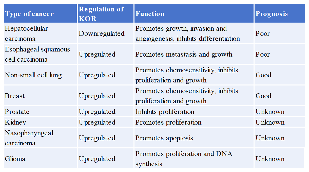 阿片類藥物是最有效的鎮(zhèn)痛藥,已廣泛用作治療疼痛和相關(guān)疾病的治療藥物。除了疼痛,阿片類藥物還經(jīng)常用于治療許多其他疾病包括腹瀉、咳嗽、術(shù)后疼痛和癌癥。有報道指出KOR可能與幾種癌癥的預(yù)后有關(guān),如下圖所示: