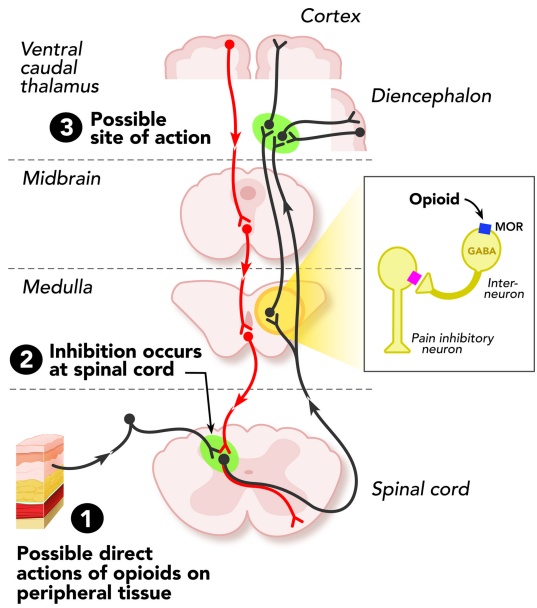 阿片受體在疼痛調(diào)節(jié)下行通路中表達(dá),其中包括髓質(zhì)藍(lán)斑和導(dǎo)水管周圍灰色區(qū)。它們也在大腦邊緣,中腦和皮質(zhì)結(jié)構(gòu)。
