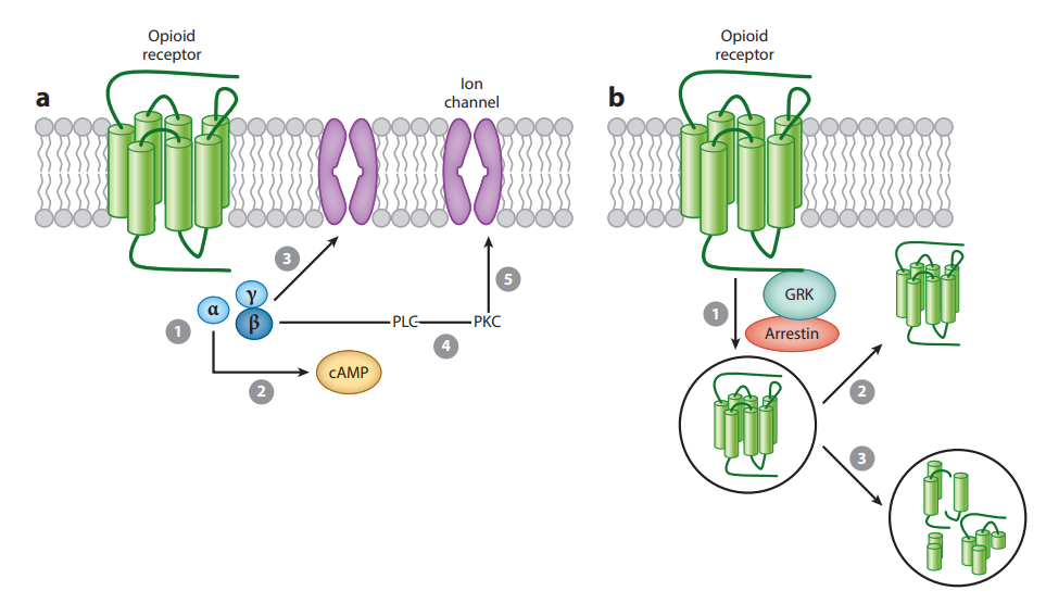 早期阿片受體藥理學(xué)研究表明,鳥嘌呤三磷酸鳥苷(GTP)等核苷酸調(diào)節(jié)激動劑與腦組織膜制劑中的阿片受體結(jié)合。后來確定GTPase活性由阿片激動劑和內(nèi)源性阿片肽調(diào)節(jié)。激動劑刺激阿片受體抑制環(huán)腺苷一磷酸(AMP)的產(chǎn)生方式與其他類型的g蛋白偶聯(lián)受體(GPCR)相似。阿片受體對cAMP信號的抑制通路屬于Gαi依賴,即阿片受體和激動劑結(jié)合時會抑制cAMP的形成。四個阿片受體具有相似的信號通路,每個阿片受體上的選擇性配體結(jié)合阿片受體后可引起cAMP形成抑制,MAPK信號通路激活,或者Arrestin招募,蛋白內(nèi)化等。